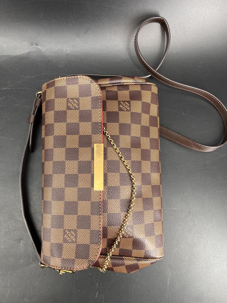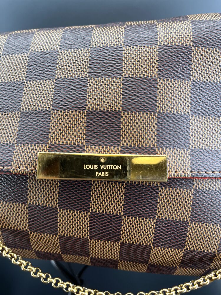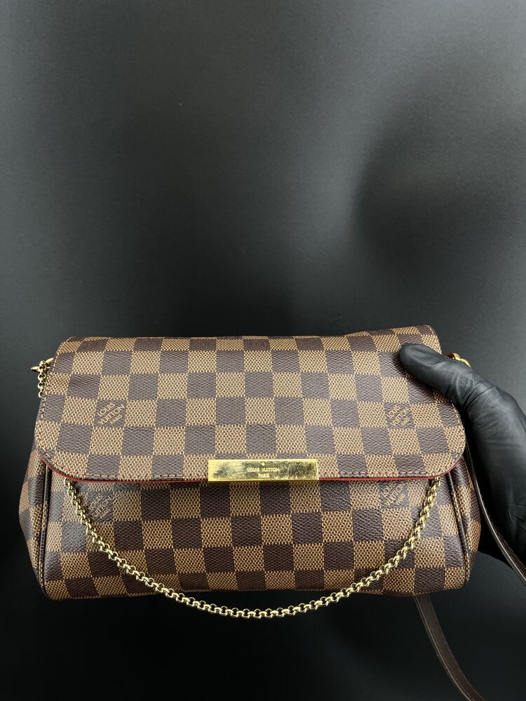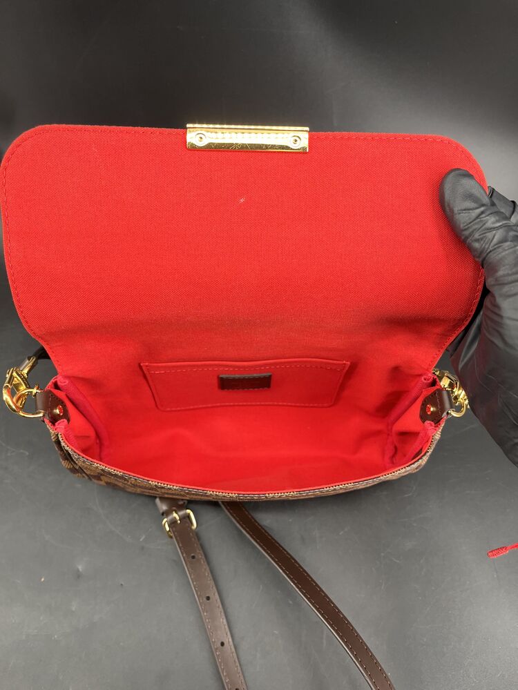 This stylish bag is the authentic Louis Vuitton Favorite MM, crafted in the signature Damier Ebene coated canvas. It features a magnetic flap closure and gold-tone hardware. Versatile in design, it can be worn as a crossbody, shoulder bag, or clutch. The item is in good condition with normal signs of use. Please review all photos closely to assess cosmetic condition as the item shown is the exact one you will receive. Please note: This item does not come with a box or dust bag.
