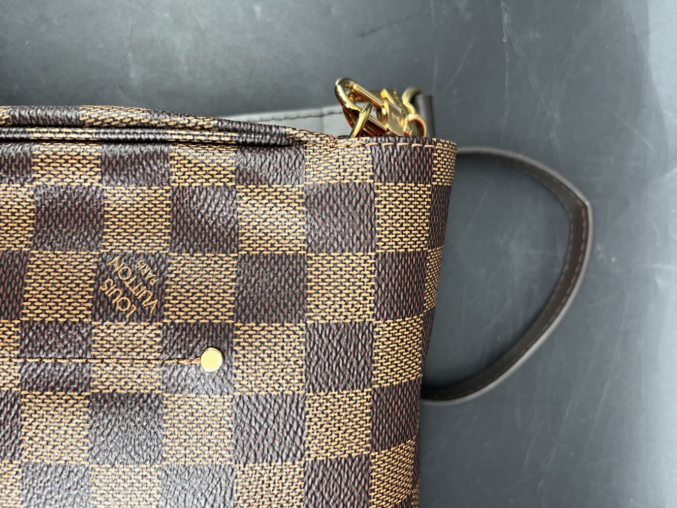 Este elegante bolso es el auténtico Louis Vuitton Favorite MM, elaborado en la emblemática lona revestida Damier Ebene. Cuenta con un cierre de solapa magnético y herrajes en tono dorado. De diseño versátil, se puede usar como bandolera, bolso de hombro o cartera de mano. El artículo está en buenas condiciones con signos normales de uso. Por favor revise todas las fotos detenidamente para evaluar la condición cosmética, ya que el artículo que se muestra es exactamente el que recibirá. Tenga en cuenta: Este artículo no viene con caja ni bolsa guardapolvo.