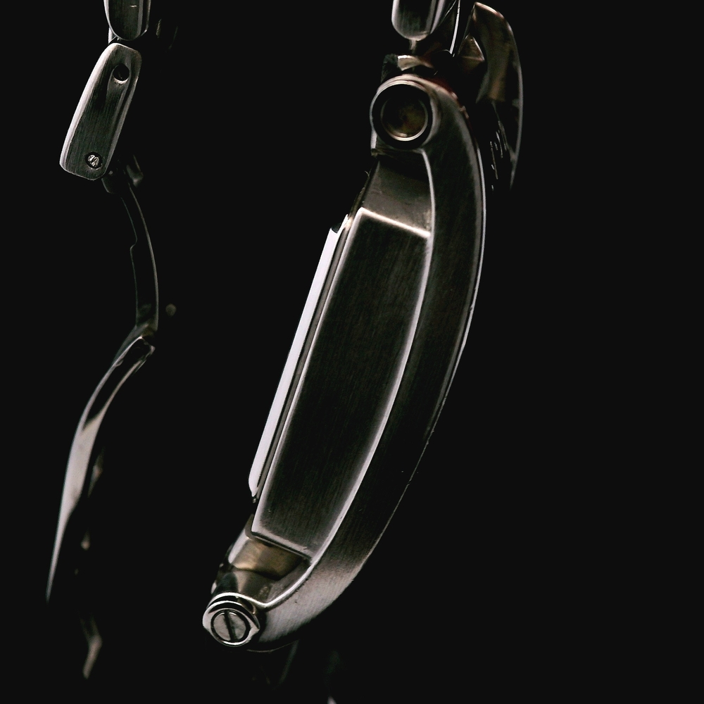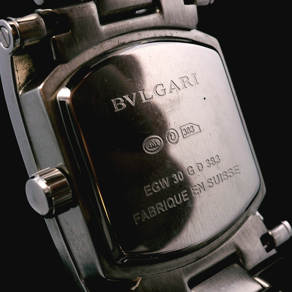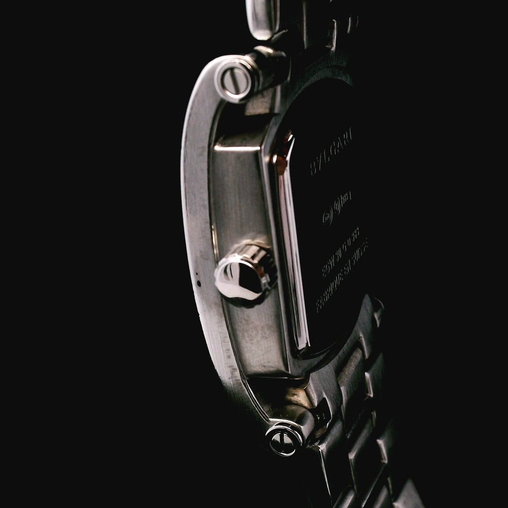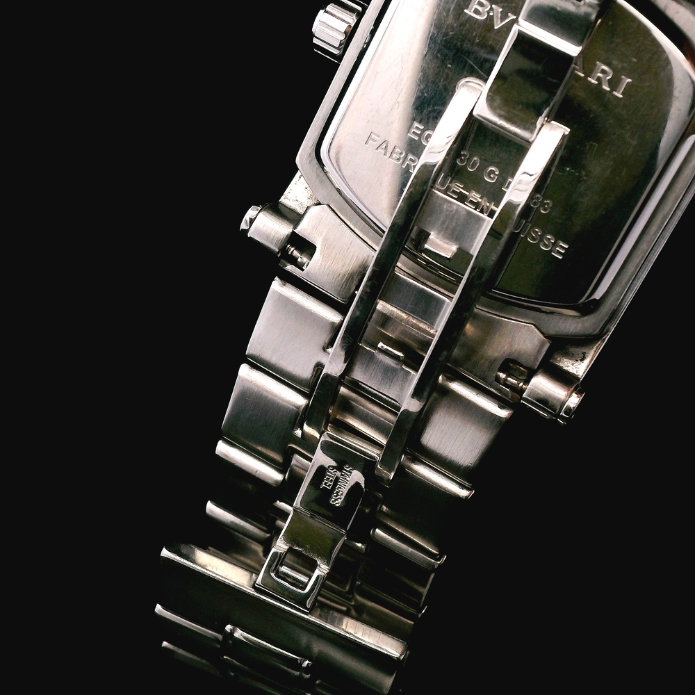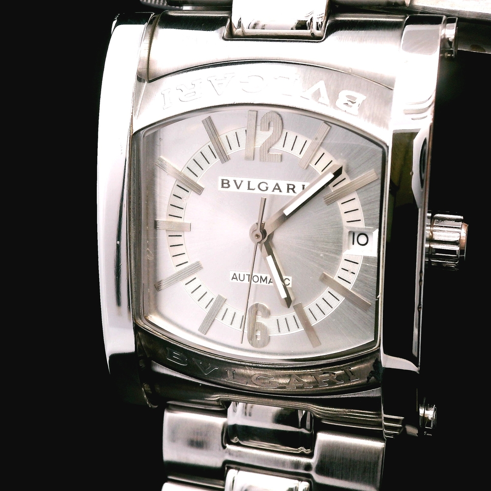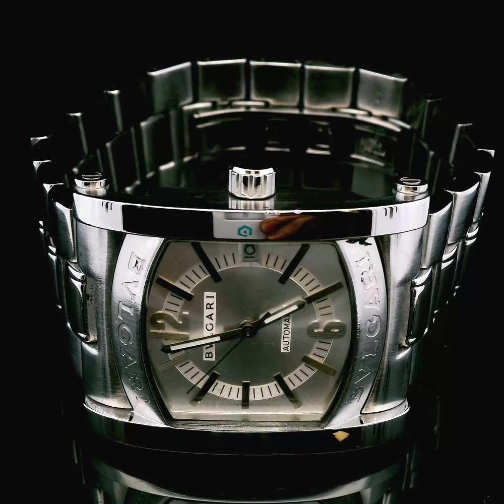 This sophisticated BVLGARI Assioma (Model AA48S) features a distinct curved rectangular case, a silver dial with a date window, and a reliable automatic movement. It is a men's timepiece designed for elegance and comfort. The listing does not include the original box or papers. The item is in good condition. Please review all photos closely to assess cosmetic condition as the item shown is the exact one you will receive. Please note: Price may vary depending on the price of gold and silver.