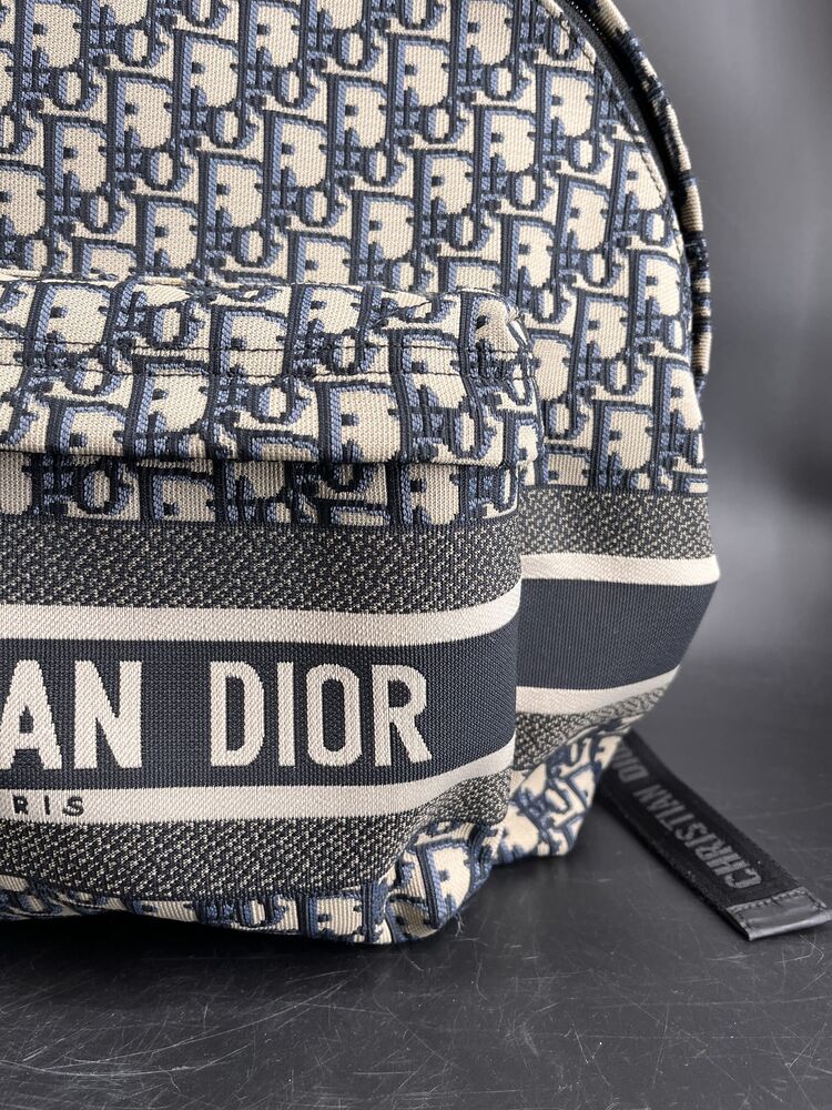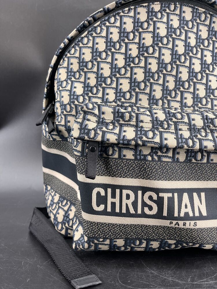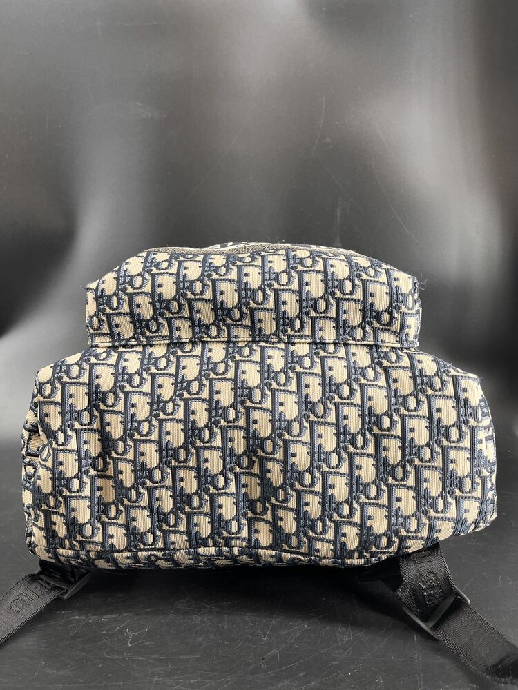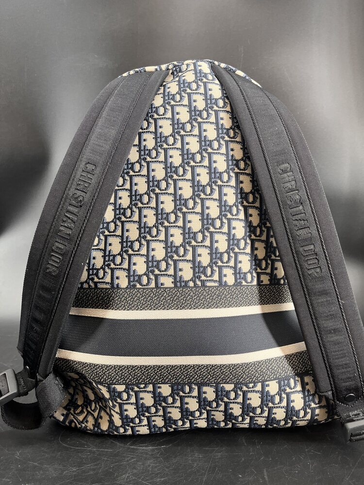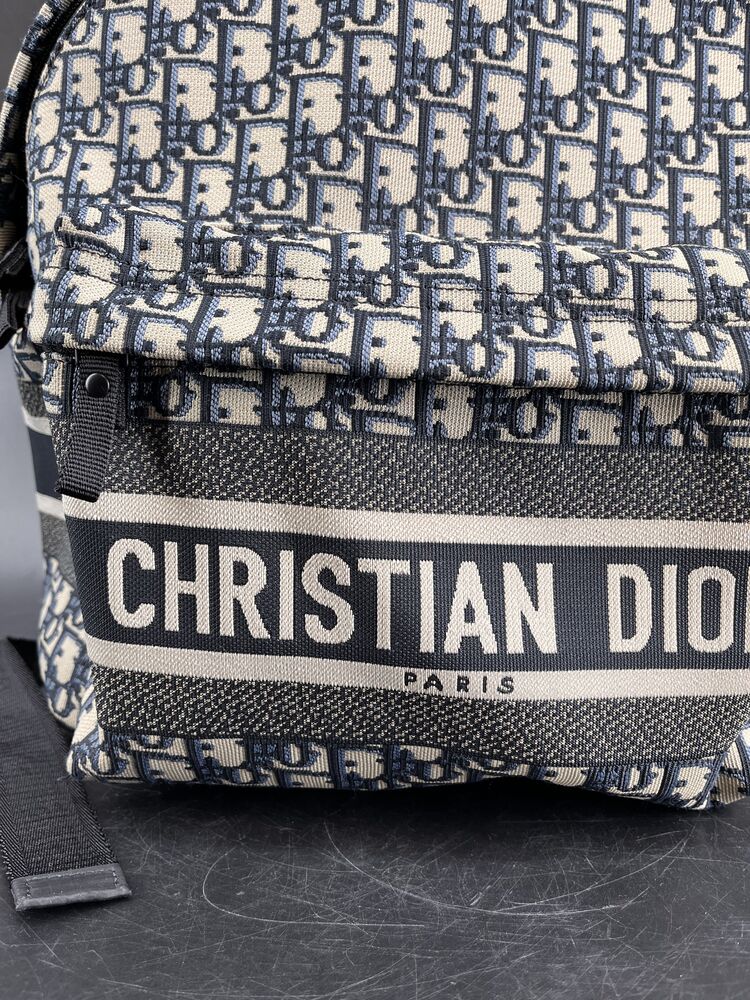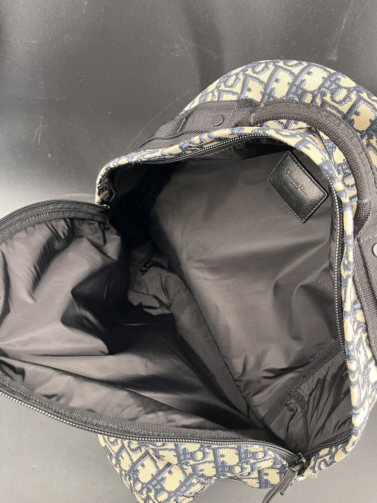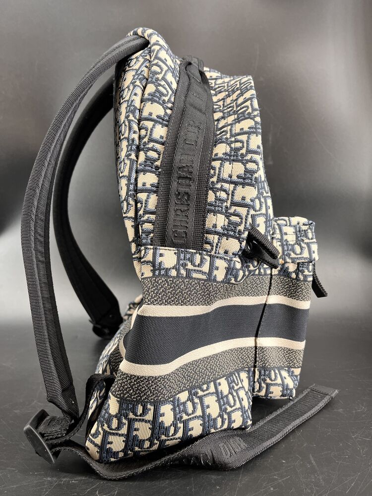 This stylish Christian Dior Homme Rider Backpack is crafted from the iconic beige and blue Dior Oblique jacquard canvas. It features a spacious main compartment, a front zippered pocket for easy access, and adjustable padded shoulder straps for comfort. It combines luxury with everyday functionality. The listing includes the original dust bag; the box is not included. The item is in good condition. Please review all photos closely to assess cosmetic condition as the item shown is the exact one you will receive.