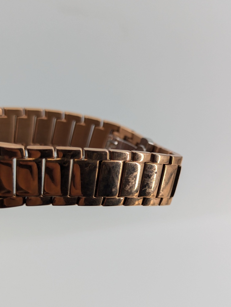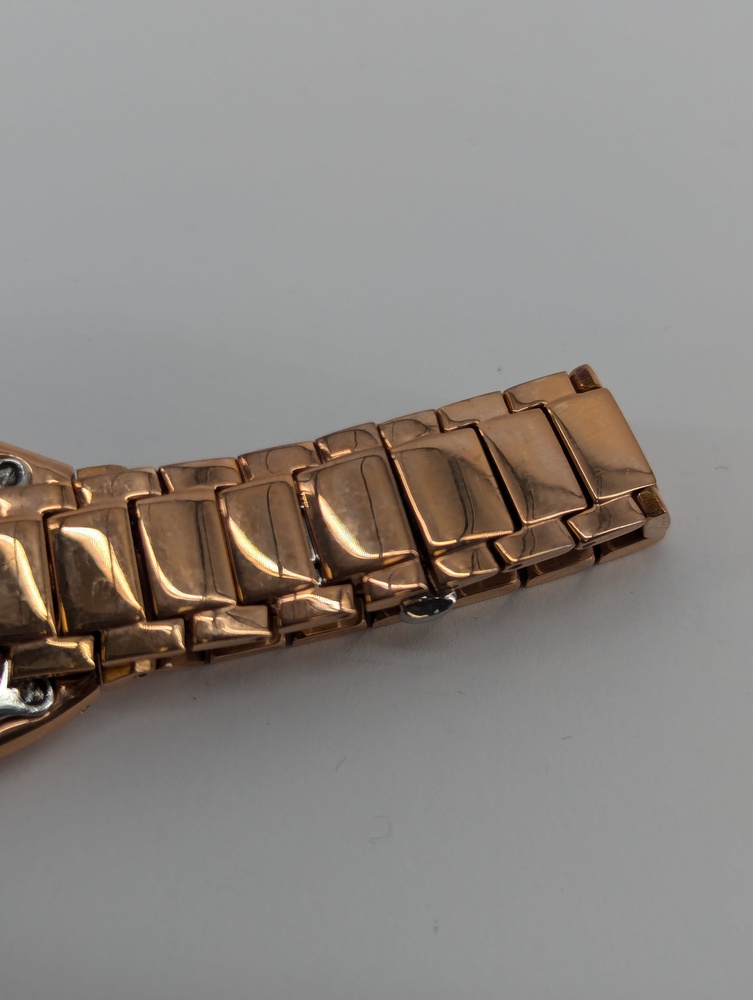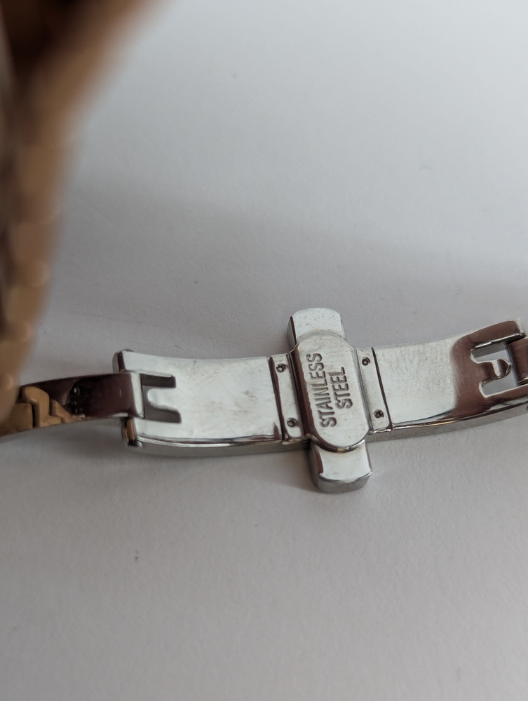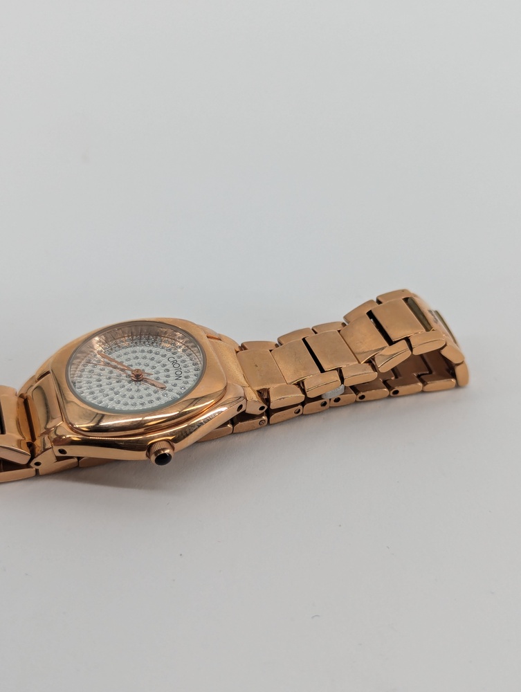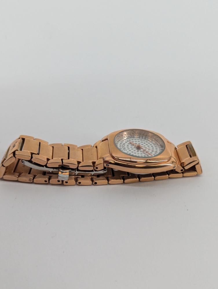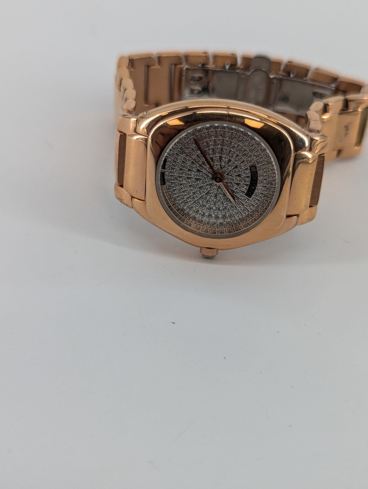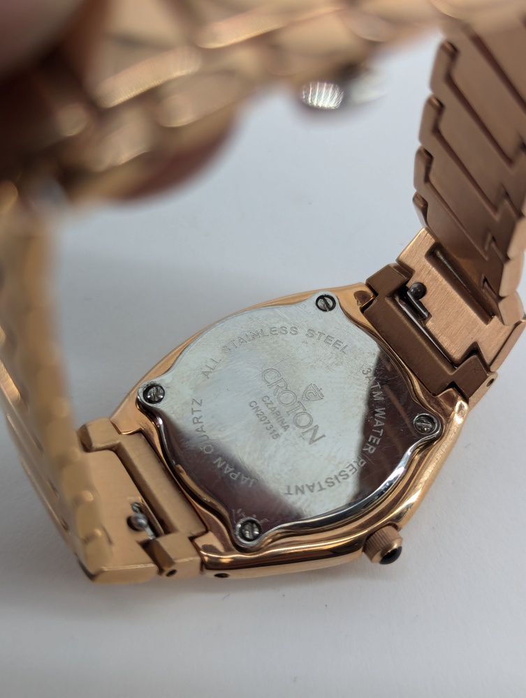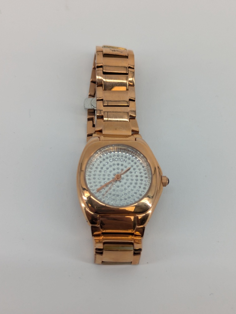Croton's stainless steel ladies' watch is a beautifully designed timepiece that combines functionality with a sleek aesthetic. The polished stainless steel case and bracelet create a sophisticated and durable finish, making it perfect for everyday wear or special occasions. Its minimalist dial is elegantly accented with clear markers and easy-to-read hands, offering timeless simplicity. Powered by a reliable quartz movement, this watch ensures accurate timekeeping. The secure clasp provides a comfortable and secure fit on the wrist, while its water resistance adds practical durability. This Croton watch is an ideal choice for those seeking a balance of elegance and practicality in a classic design.