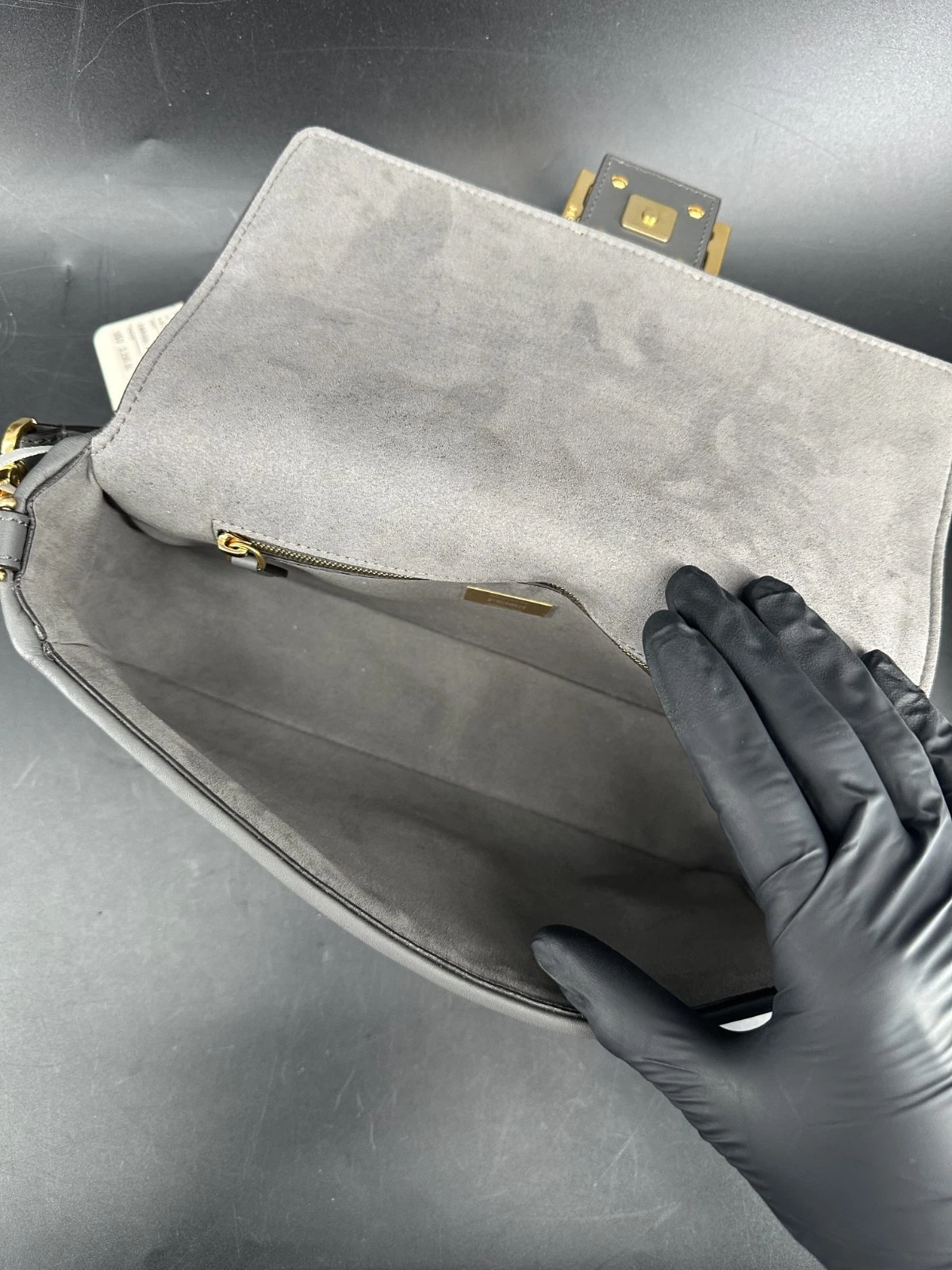 El bolso Fendi Baguette en lienzo con logotipo gris es un icónico bolso de hombro de lujo, con el característico lienzo con logotipo de Fendi en un elegante diseño gris. Este bolso completamente nuevo ofrece un interior compacto pero funcional, un cierre de solapa con la hebilla FF distintiva y una correa de hombro ajustable para un estilo versátil. Perfecto para entusiastas de la moda que buscan una pieza atemporal, incluye su caja original, documentos y certificado de autenticidad de Entrupy.