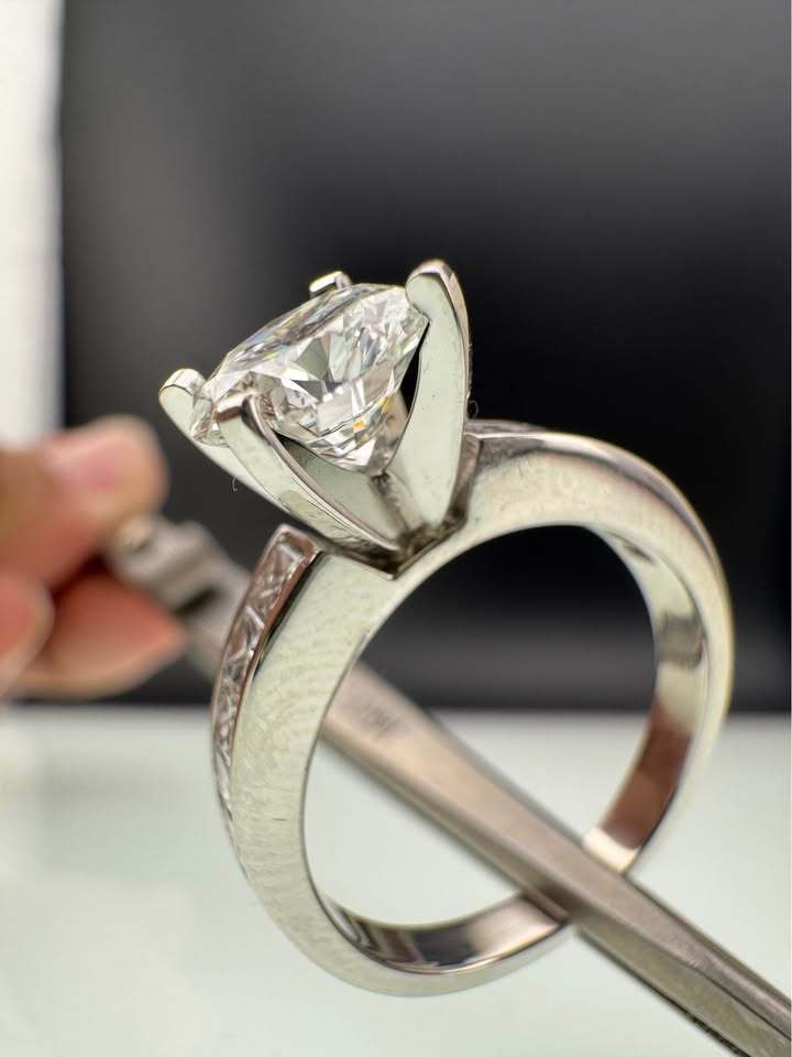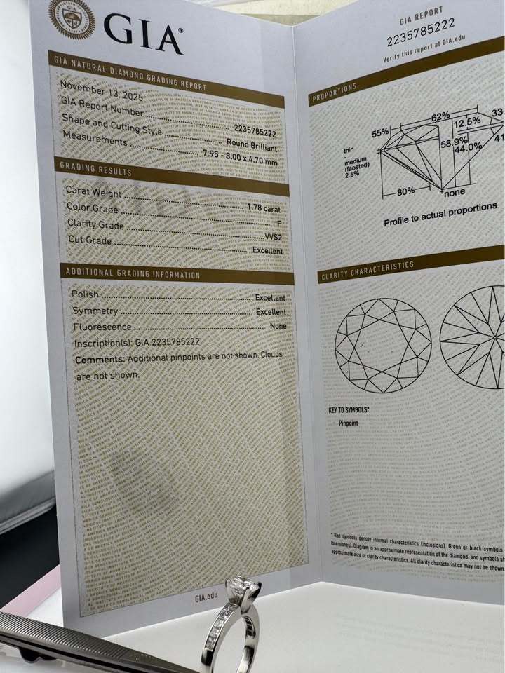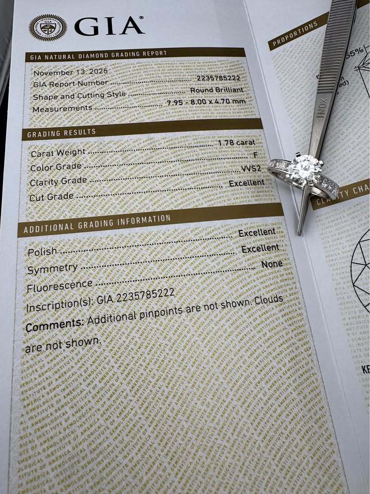 This is a GIA certified 1.78 carat Round Brilliant diamond, set in a gorgeous white gold ring with channel-set side stones. The center stone is everything buyers look for — F color, VVS2 clarity, Excellent cut, Excellent polish, Excellent symmetry a truly elite combination that delivers maximum brilliance. The ring comes with the full GIA report matching inscription on the diamond for verification.