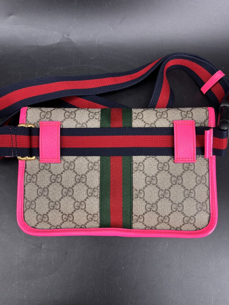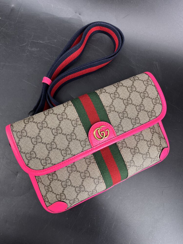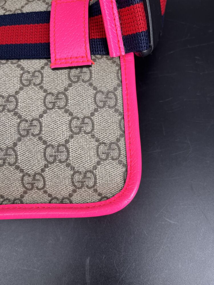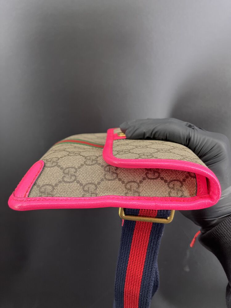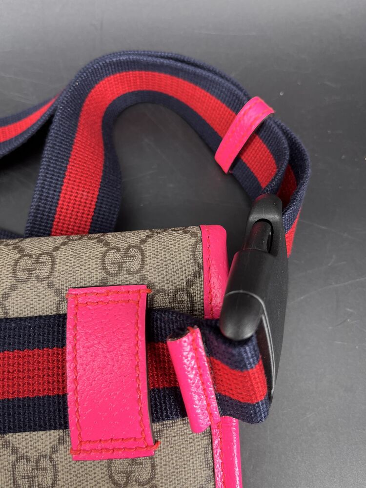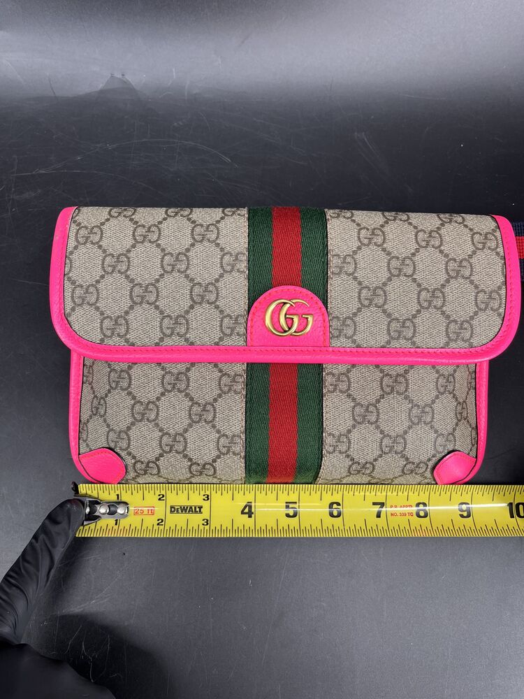 This stylish Gucci Ophidia Small Belt Bag is crafted from the signature GG Supreme canvas accented with pink leather trim and the iconic green and red Web stripe. It features a top zipper closure, gold-tone hardware, and an adjustable waist strap.1 The listing includes the original box. The item is in good condition. Please review all photos closely to assess cosmetic condition as the item shown is the exact one you will receive.