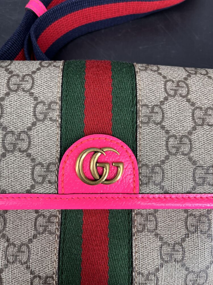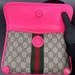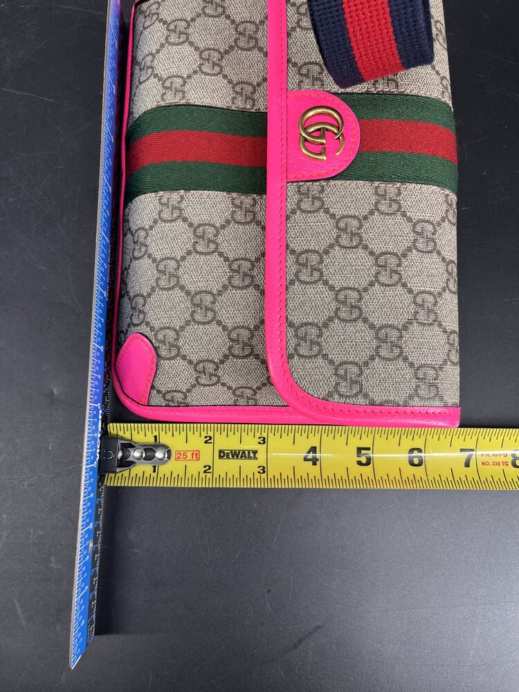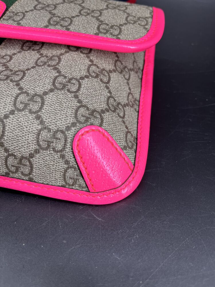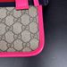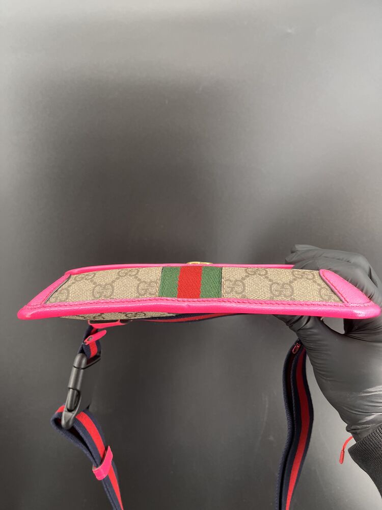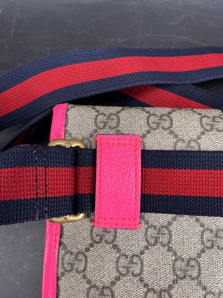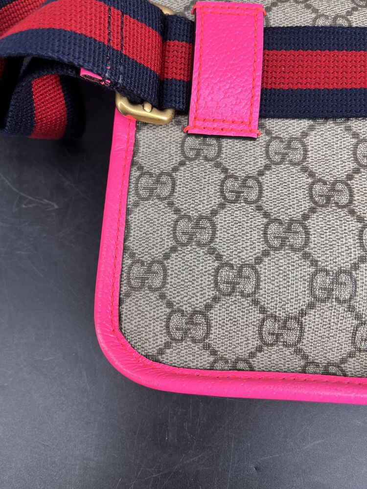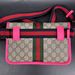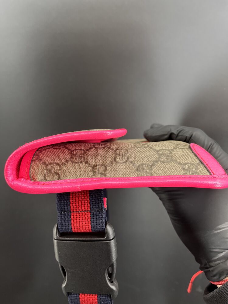 This stylish Gucci Ophidia Small Belt Bag is crafted from the signature GG Supreme canvas accented with pink leather trim and the iconic green and red Web stripe. It features a top zipper closure, gold-tone hardware, and an adjustable waist strap.1 The listing includes the original box. The item is in good condition. Please review all photos closely to assess cosmetic condition as the item shown is the exact one you will receive.