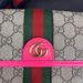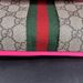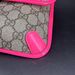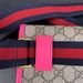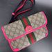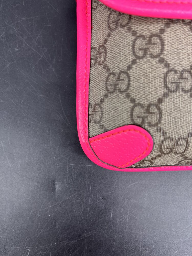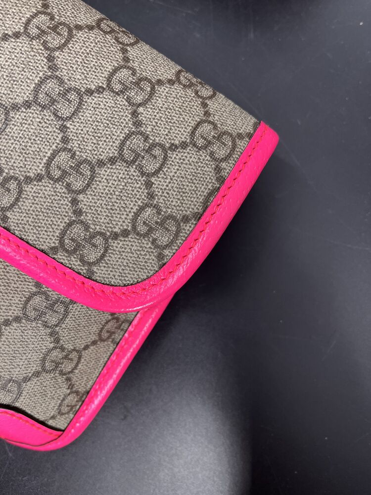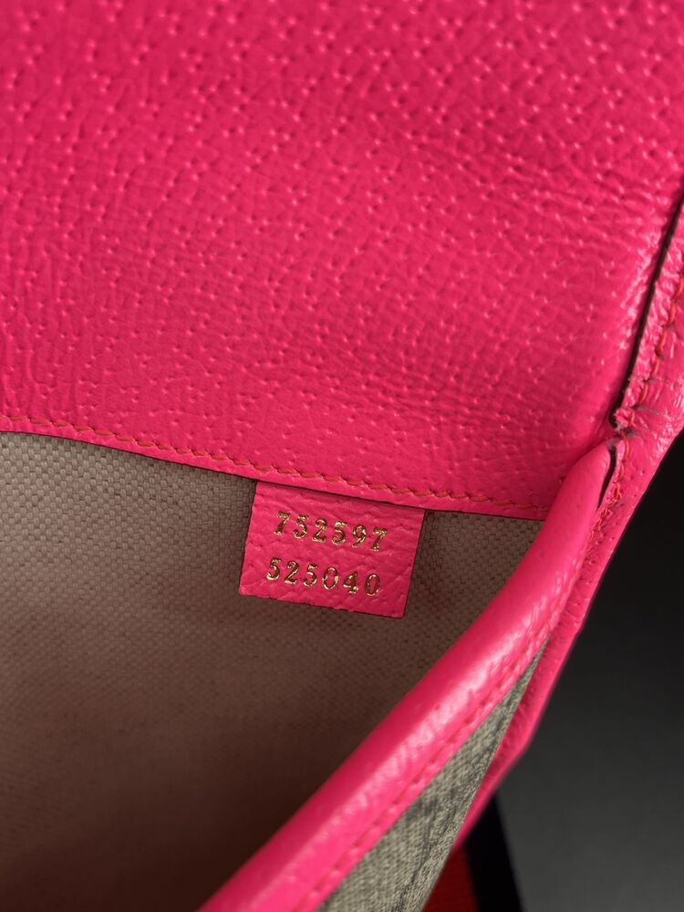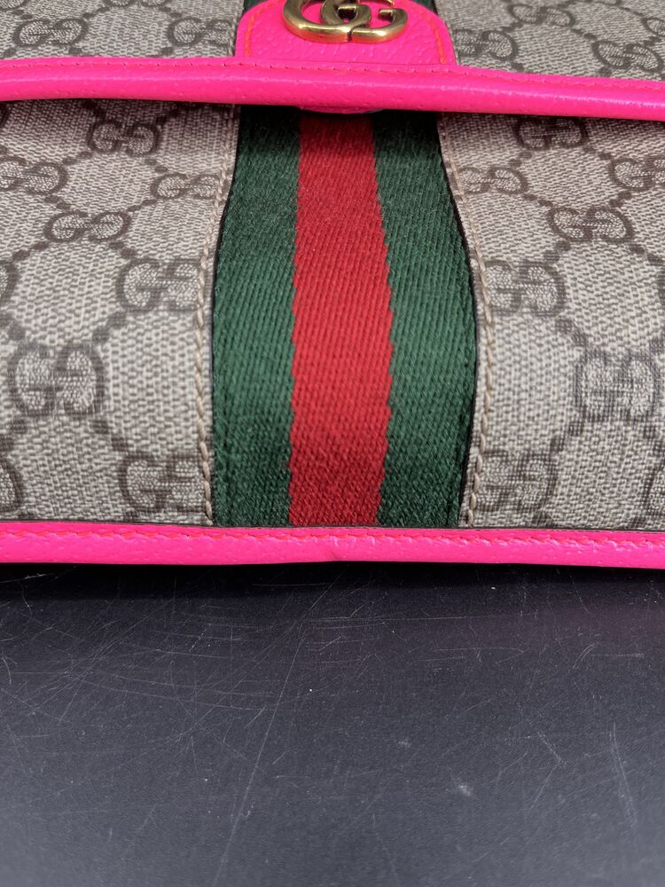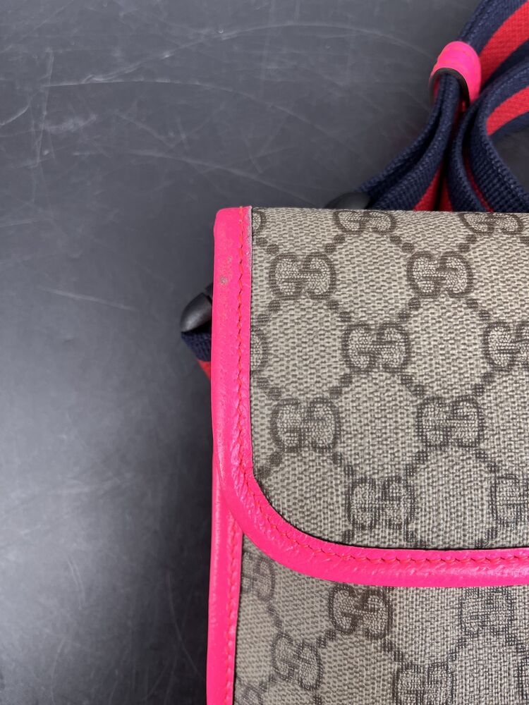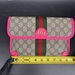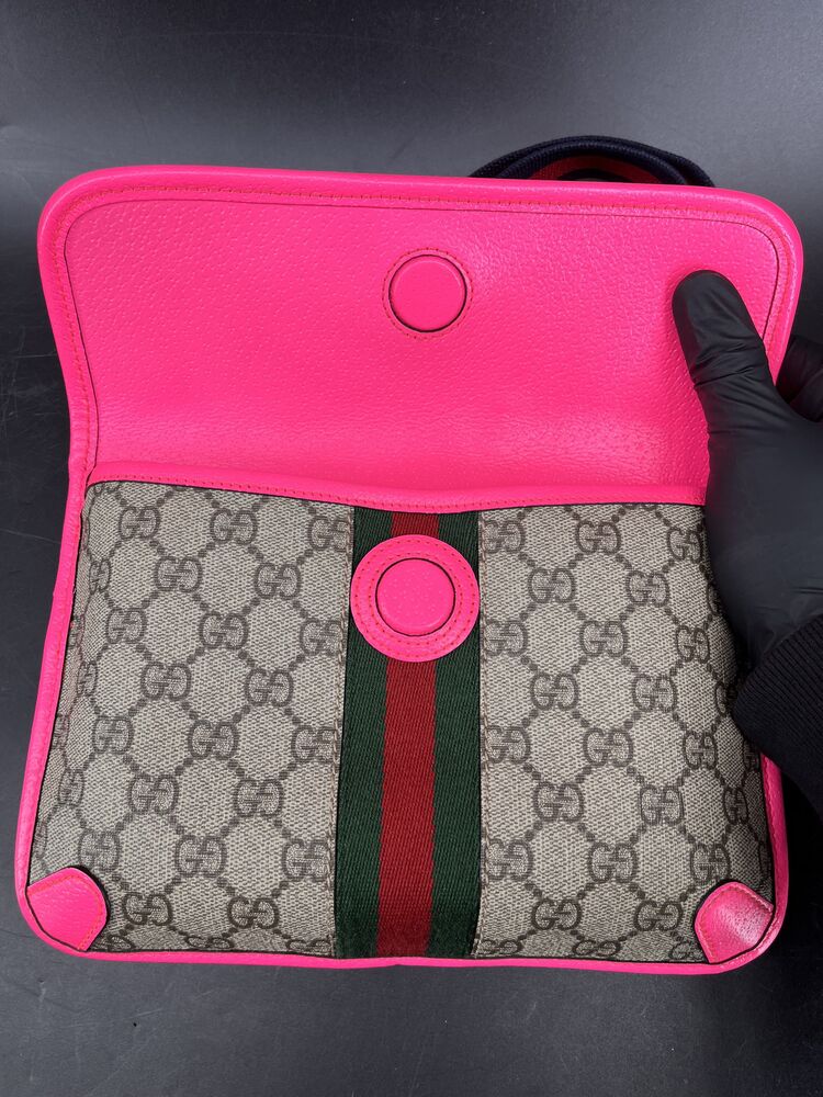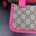 This stylish Gucci Ophidia Small Belt Bag is crafted from the signature GG Supreme canvas accented with pink leather trim and the iconic green and red Web stripe. It features a top zipper closure, gold-tone hardware, and an adjustable waist strap.1 The listing includes the original box. The item is in good condition. Please review all photos closely to assess cosmetic condition as the item shown is the exact one you will receive.