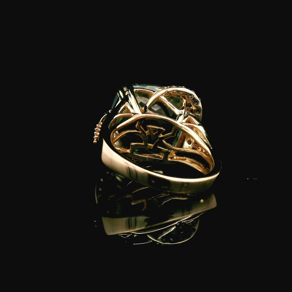 Este impresionante anillo de Le Vian está elaborado en oro amarillo de 14 quilates y presenta un cuarzo Mint Julep en corte cojín, engastado con garras. Como acento, el anillo incluye 0.20 quilates de diamantes vainilla y chocolate en corte redondo. Los diamantes están ubicados en esquinas opuestas de la piedra central y a lo largo de partes de la banda, añadiendo brillo y dimensión. El contraste entre el cálido oro amarillo y el suave tono verde del cuarzo Mint Julep le da al anillo un aspecto vibrante y elegante. La talla del anillo es 7 y pesa aproximadamente 8.86 gramos. Se entrega con una caja genérica para anillos.