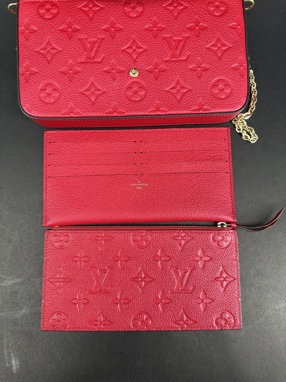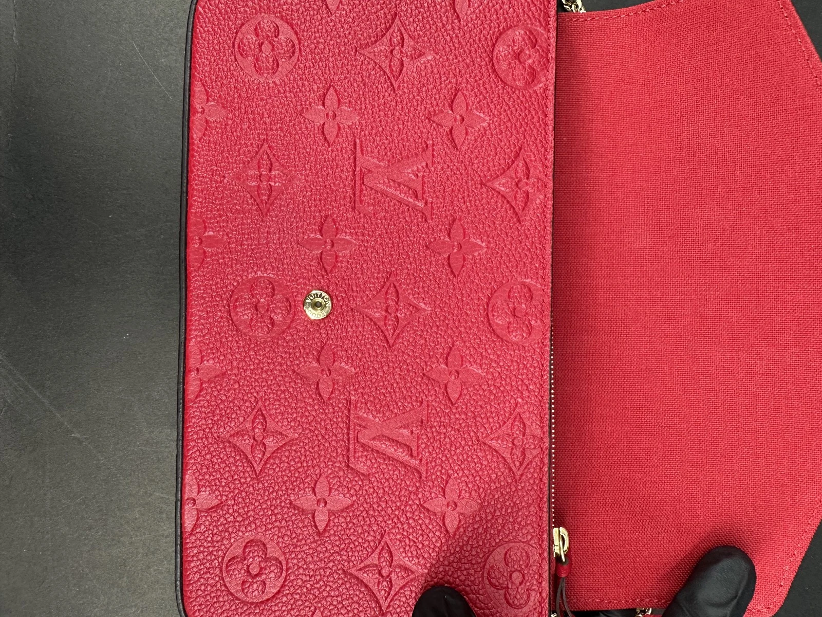The Louis Vuitton Felicie Pochette in Monogram Empreinte Leather Red is a luxurious and versatile accessory featuring premium embossed leather with the iconic Monogram pattern. This chic pochette includes a detachable chain for shoulder or crossbody wear, a removable insert for organization, and a vibrant red finish. Perfect for day-to-night styling or special occasions, it combines elegance with functionality.