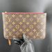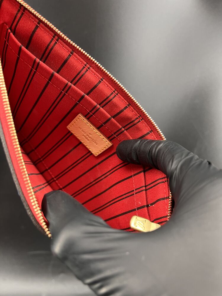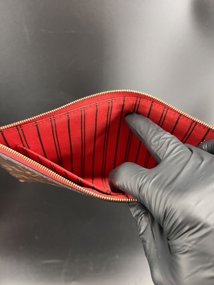 Esta es la versátil y muy buscada pochette con cremallera que se vende originalmente con el bolso tote Louis Vuitton Neverfull MM. Es perfecta para usar como muñequera (wristlet) independiente, como clutch para una salida nocturna o como estuche de cosméticos dentro de un bolso más grande.