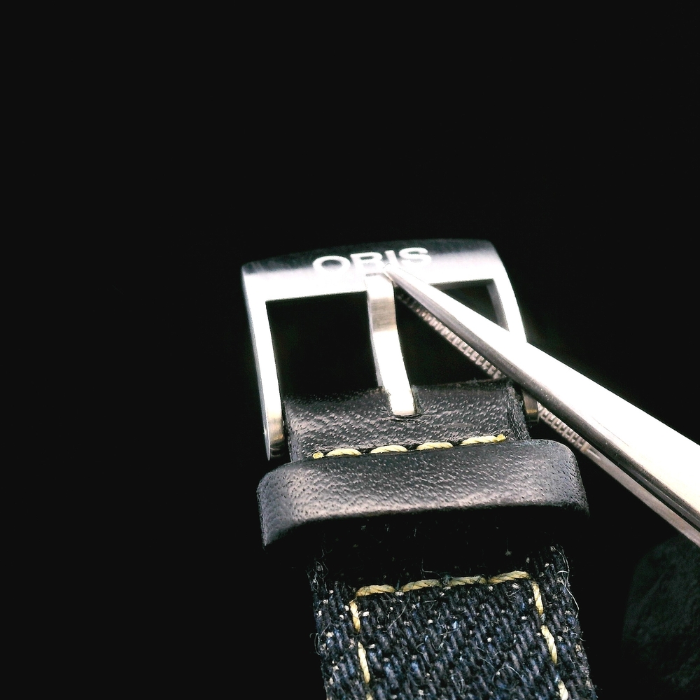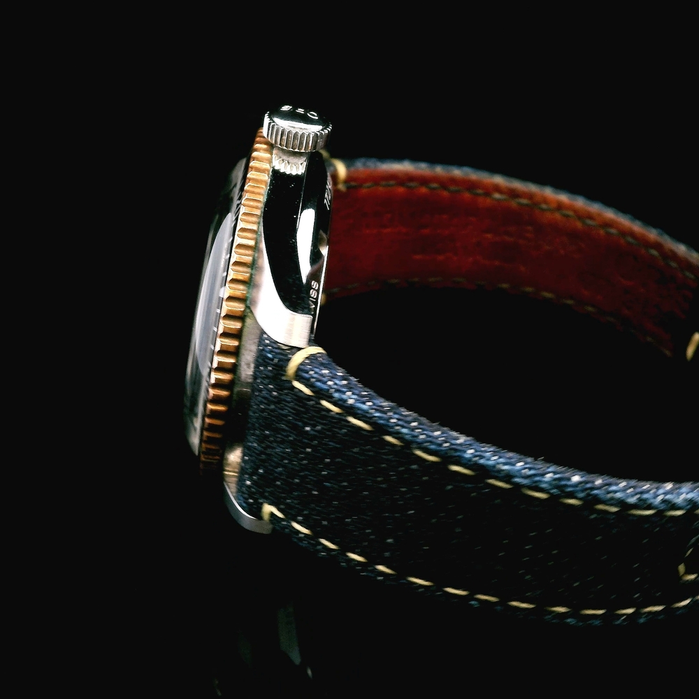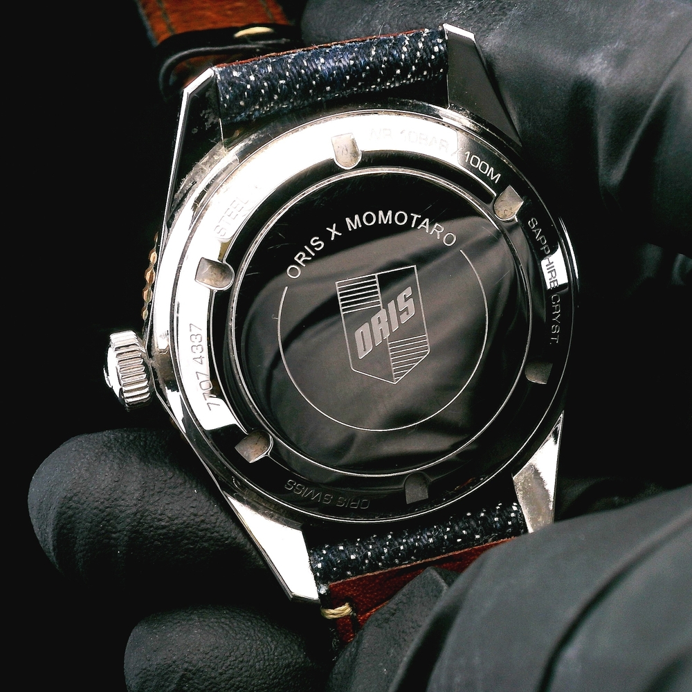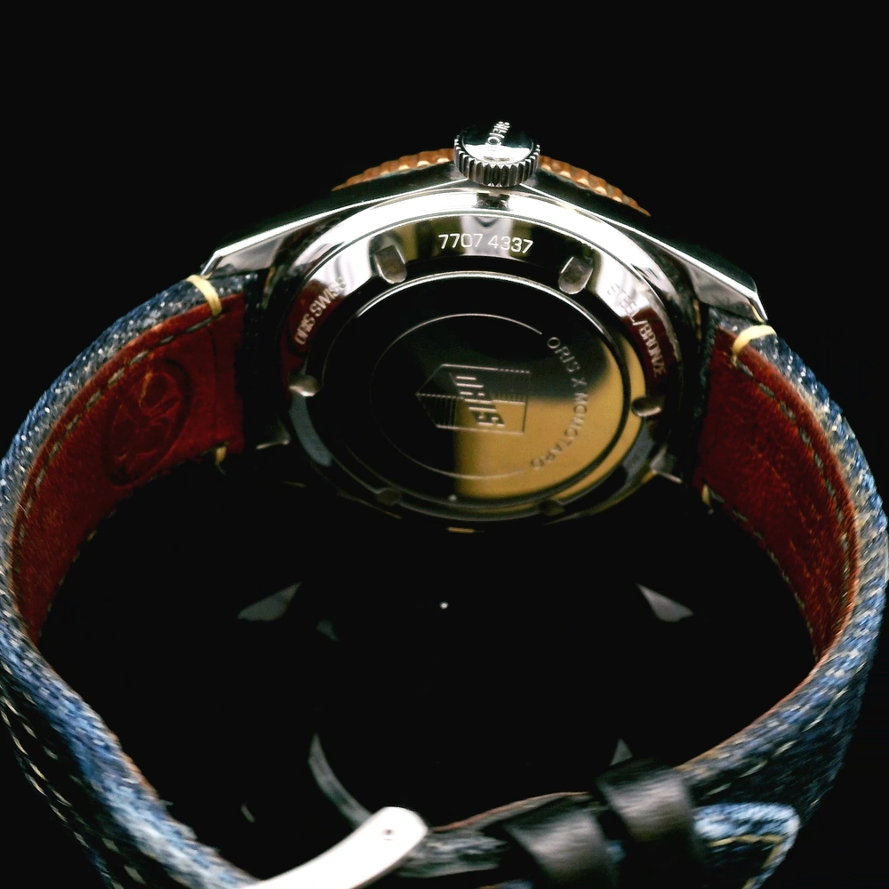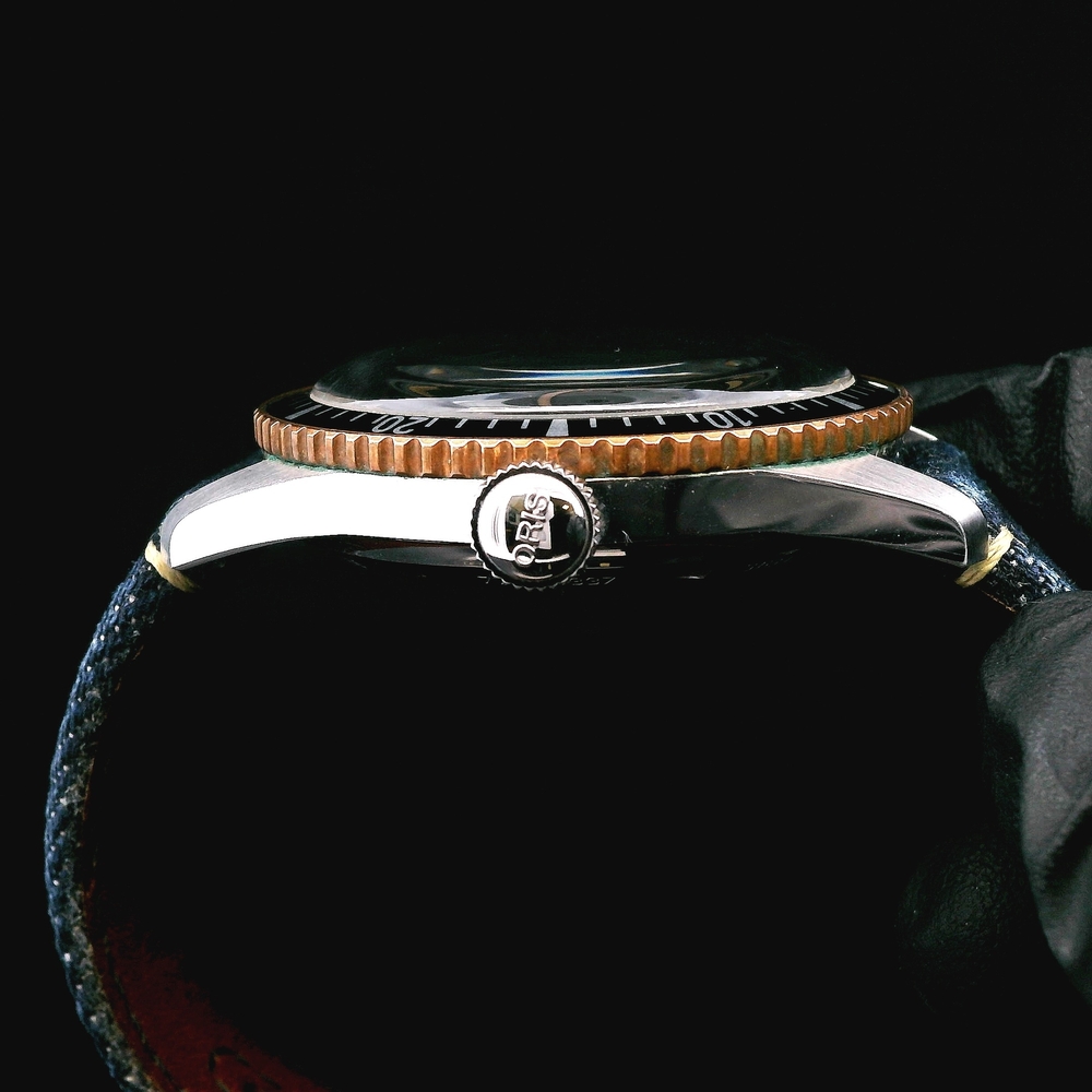 This special edition Oris Divers Sixty-Five "Momotaro" watch features a 40mm stainless steel case with a bronze-edged bezel and a unique gradient green dial. A collaboration with the Japanese denim brand Momotaro, it comes on the signature indigo denim strap with white "battle stripes." The watch is powered by an automatic movement. This listing includes the original box, the denim carrying case (travel pouch), and a polishing cloth. Please note: Original papers are NOT included. The item is in good condition. Please review all photos closely to assess cosmetic condition as the item shown is the exact one you will receive. Please note: Price may vary depending on the price of gold and silver.