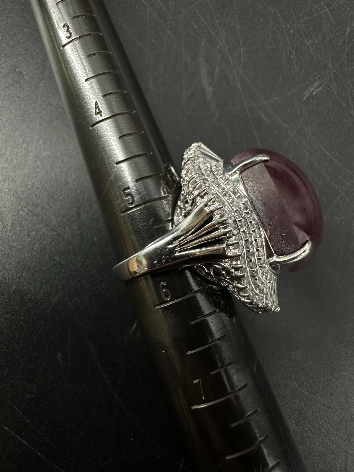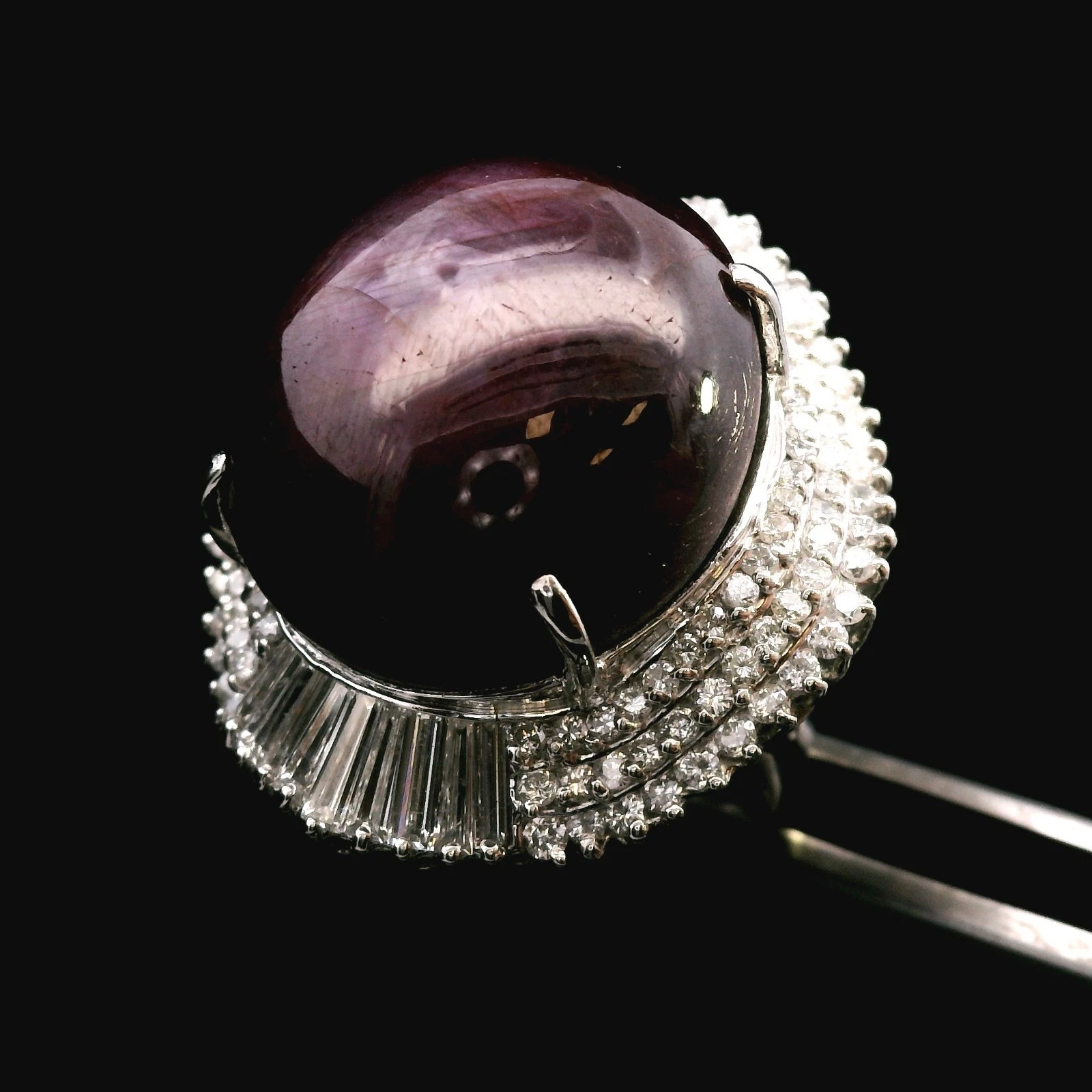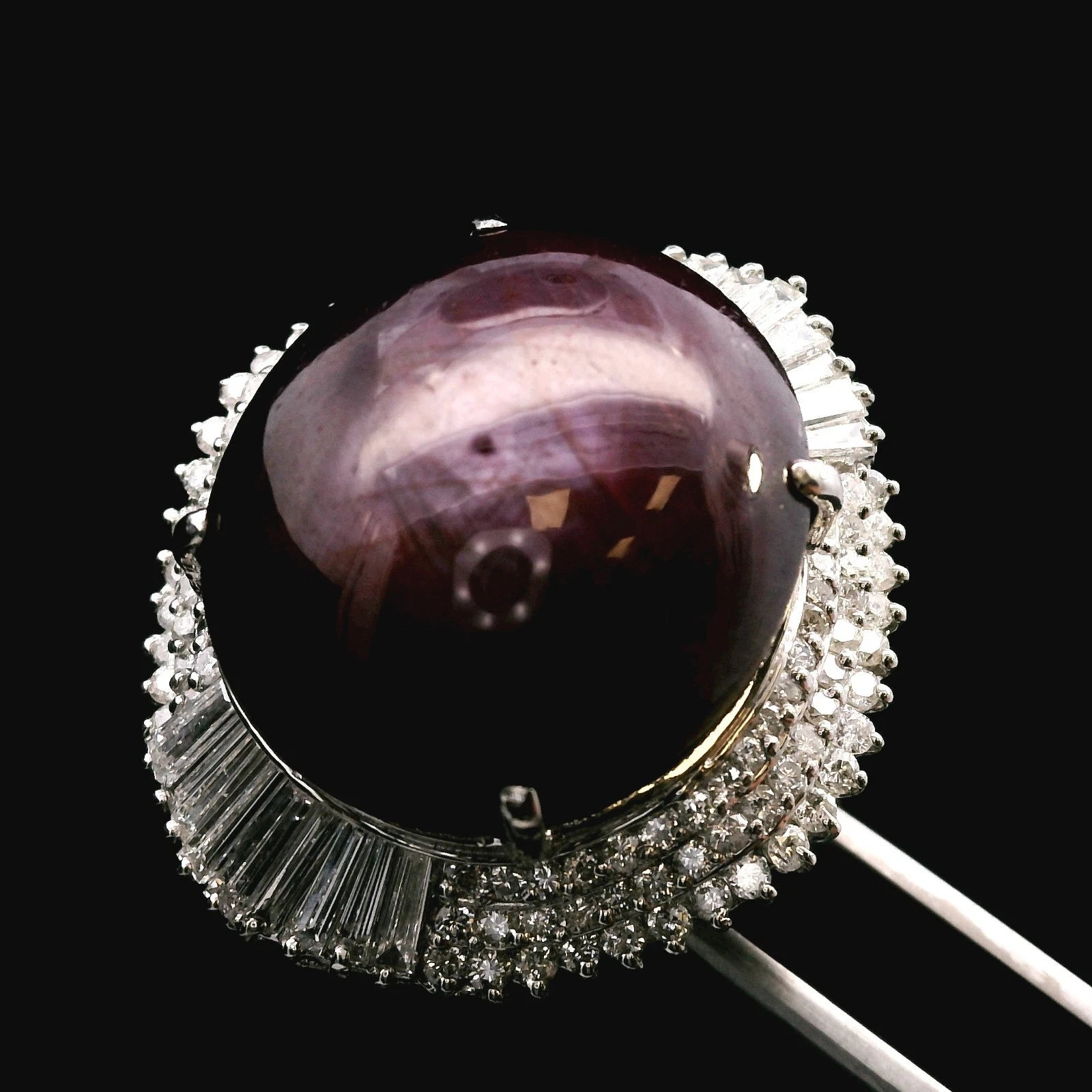 This platinum (.900) ring showcases a breathtaking natural star ruby weighing 54.3 carats, certified by GIA (Report #5232521510). The captivating star ruby is accented with diamonds totaling approximately 2.00 carats, adding brilliance and elegance to this extraordinary piece. Sized at 5.75, the ring offers a secure and comfortable fit while displaying exceptional craftsmanship. With a total weight of 19.10 DWT (29.69 grams), it has a substantial and luxurious feel. This rare and collectible piece includes its GIA certification for authenticity. It comes with a generic jewelry box.