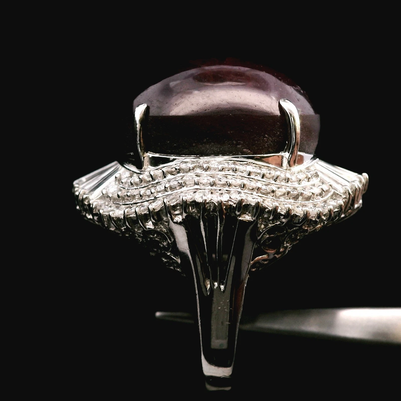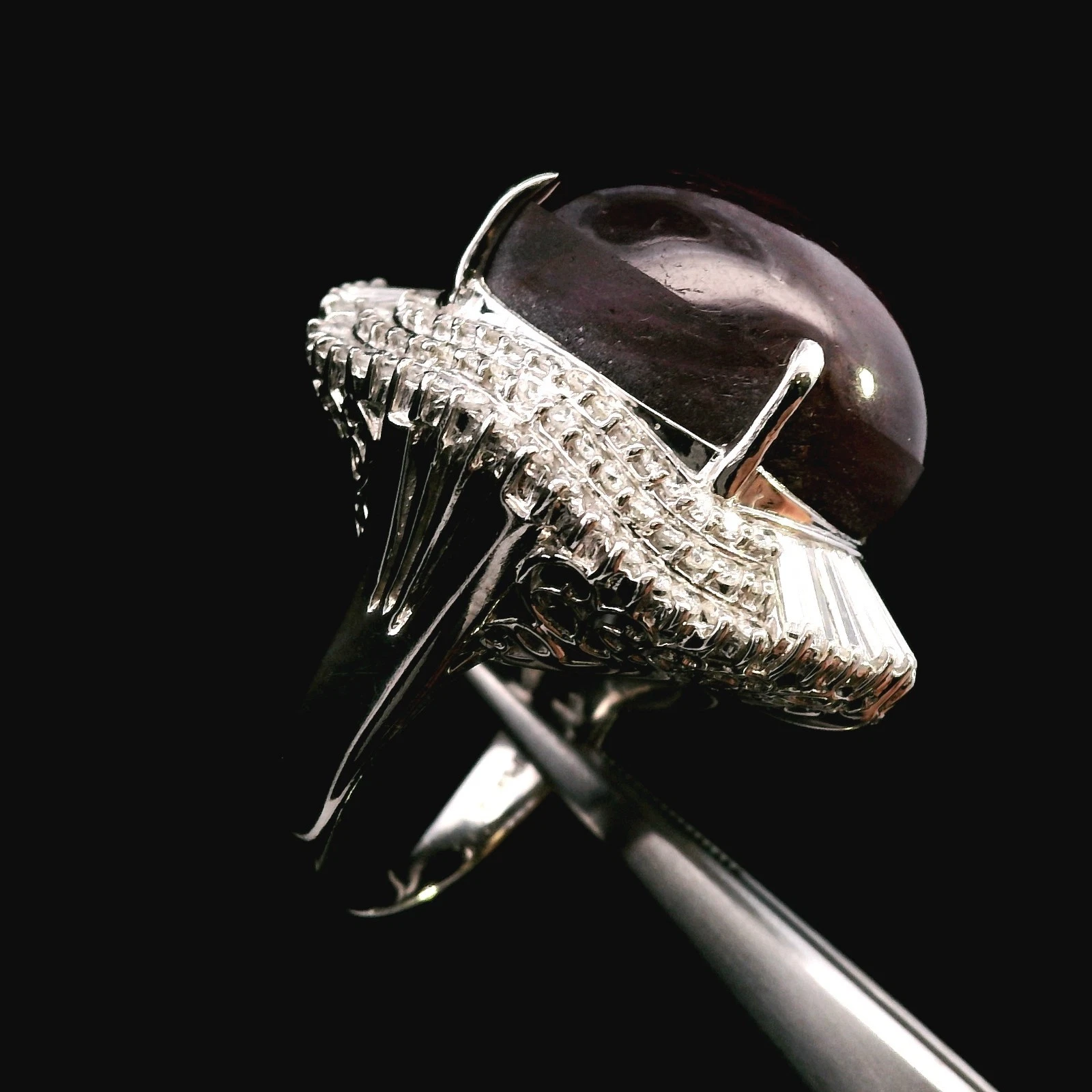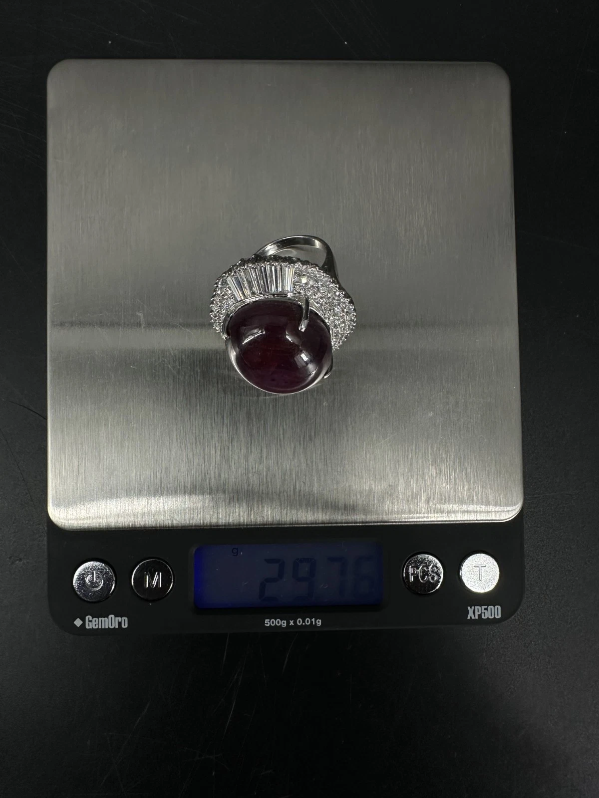 This platinum (.900) ring showcases a breathtaking natural star ruby weighing 54.3 carats, certified by GIA (Report #5232521510). The captivating star ruby is accented with diamonds totaling approximately 2.00 carats, adding brilliance and elegance to this extraordinary piece. Sized at 5.75, the ring offers a secure and comfortable fit while displaying exceptional craftsmanship. With a total weight of 19.10 DWT (29.69 grams), it has a substantial and luxurious feel. This rare and collectible piece includes its GIA certification for authenticity. It comes with a generic jewelry box.