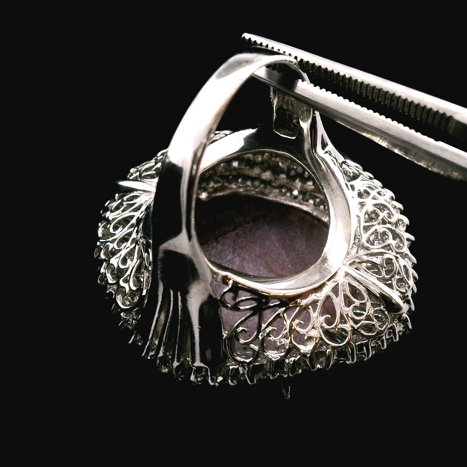 Este anillo de platino (.900) presenta un impresionante rubí estrella natural con un peso de 54.3 quilates, certificado por GIA (Informe #5232521510). El cautivador rubí estrella está adornado con diamantes con un peso total aproximado de 2.00 quilates, añadiendo brillo y elegancia a esta pieza extraordinaria. Con talla 5.75, el anillo ofrece un ajuste seguro y cómodo, mostrando una artesanía excepcional. Con un peso total de 19.10 DWT (29.69 gramos), tiene una sensación sustancial y lujosa. Esta pieza rara y coleccionable incluye su certificación GIA para garantizar su autenticidad. Viene con una caja de joyería genérica.