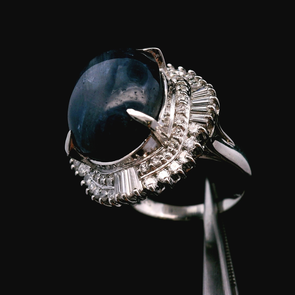 This .950 platinum ring showcases a striking natural star sapphire, displaying the signature asterism effect when light moves across the surface. The sapphire is accented by sparkling diamonds, adding brilliance that complements the deep blue center stone. The platinum setting provides exceptional durability and a luxurious feel.