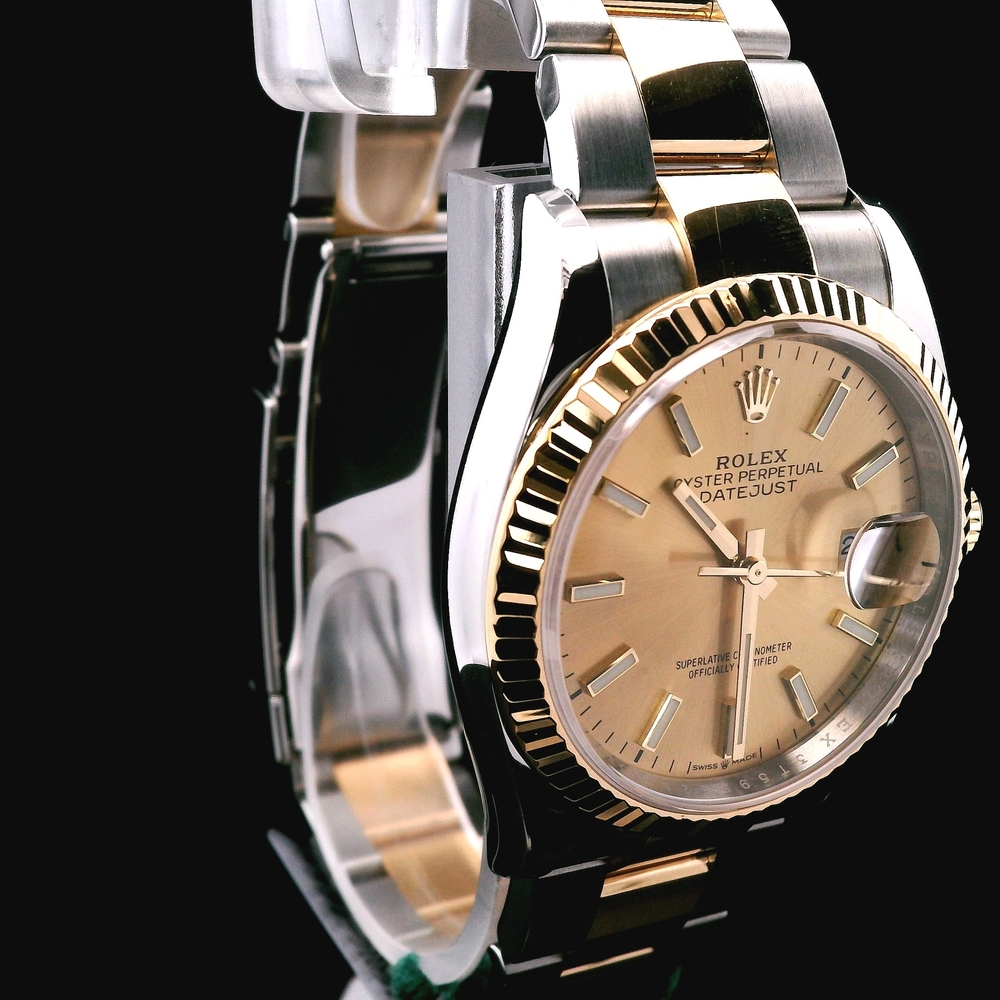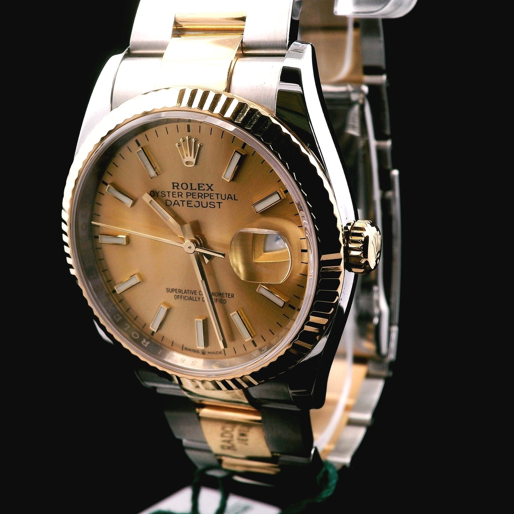 This Rolex Datejust 36mm (Ref. 126233) features a two-tone stainless steel and 18K yellow gold construction with a fluted bezel and champagne dial. A timeless and iconic configuration known for its clean, classic, and instantly recognizable look.