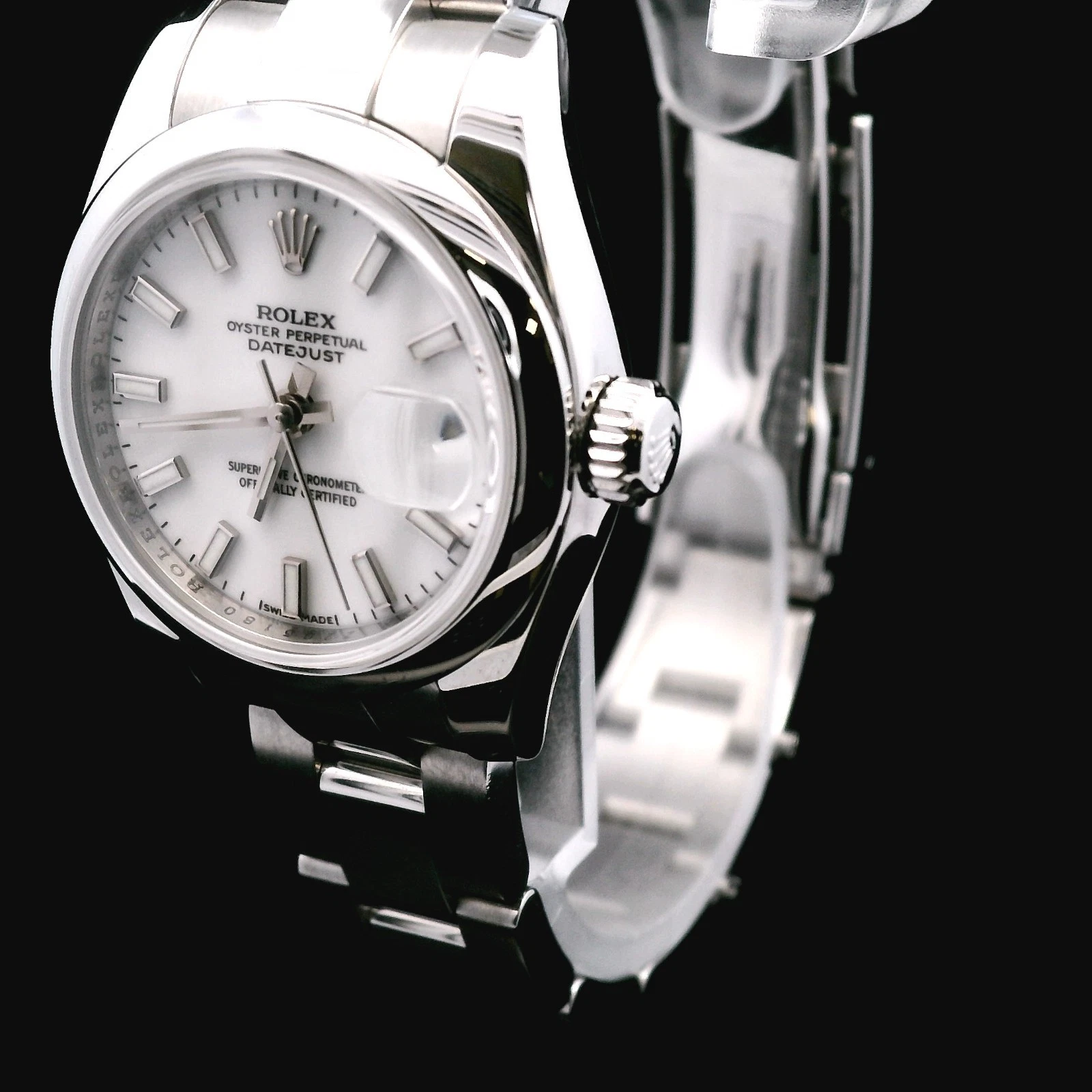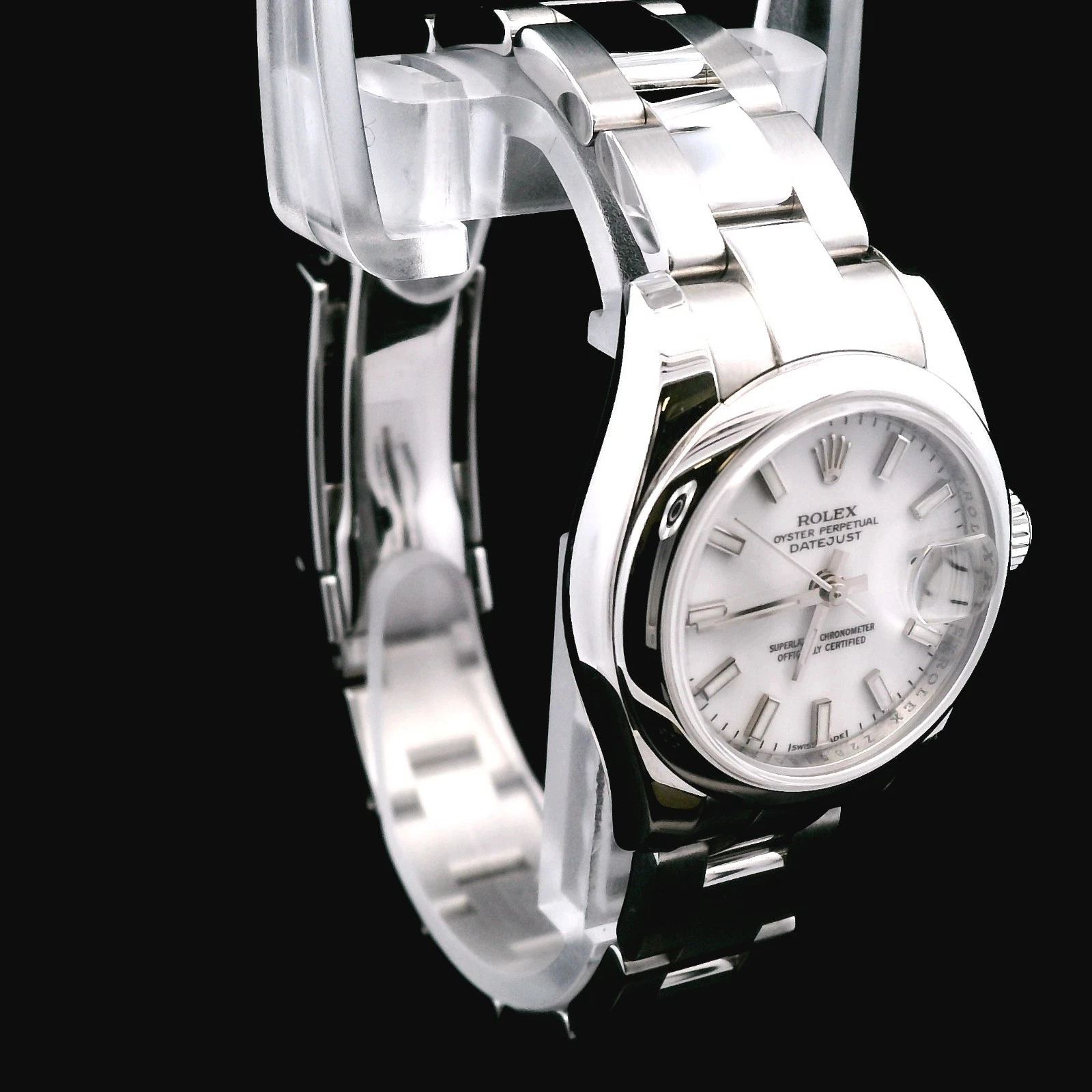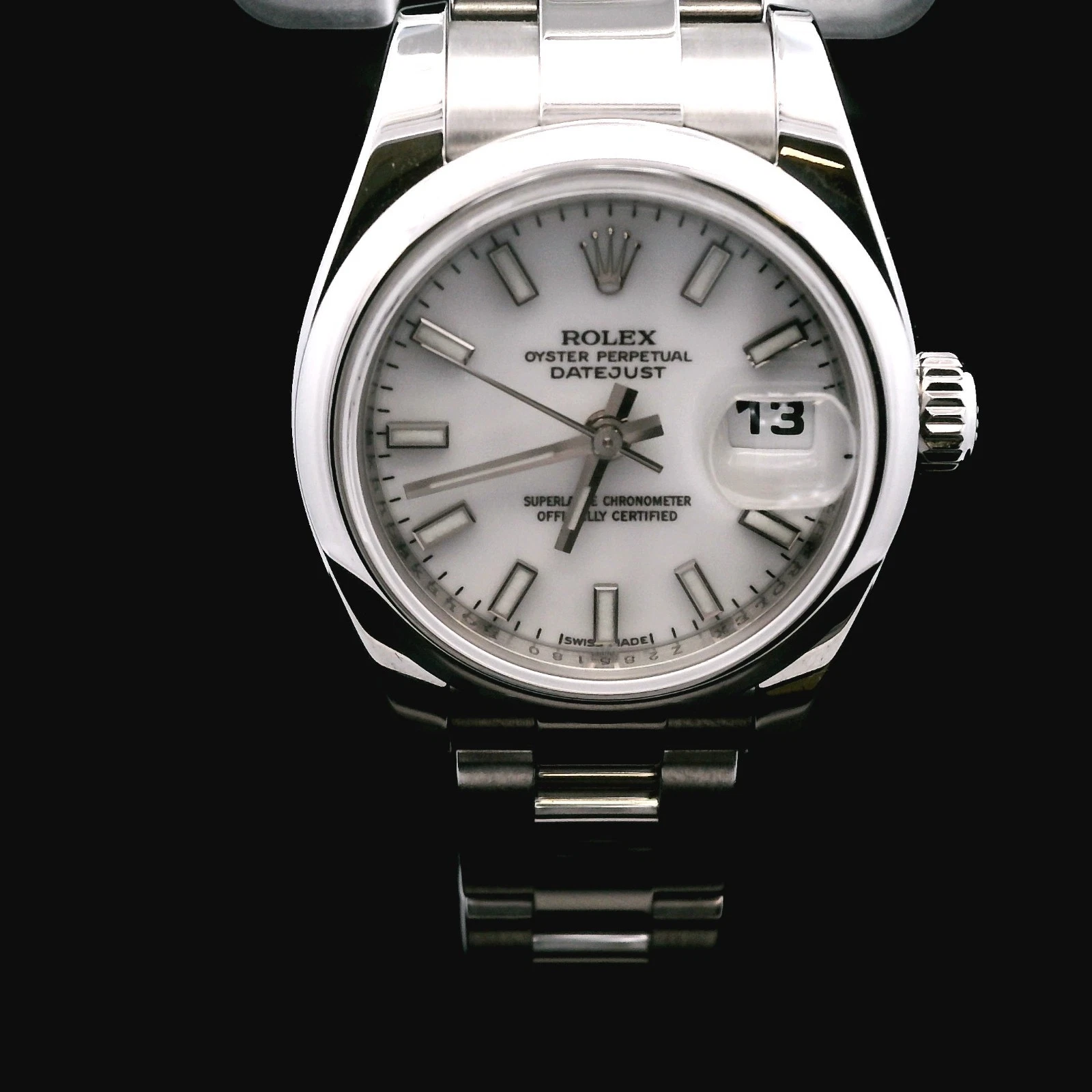 The Rolex Ladies 26mm Stainless Steel DateJust with White Index Dial and Oyster Band is a timeless luxury timepiece. Featuring a 26mm stainless steel case, a clean white dial with index markers, and the iconic Oyster bracelet, this watch offers precision and elegance. Powered by Rolex’s automatic movement with date function, it’s perfect for daily wear or special occasions.