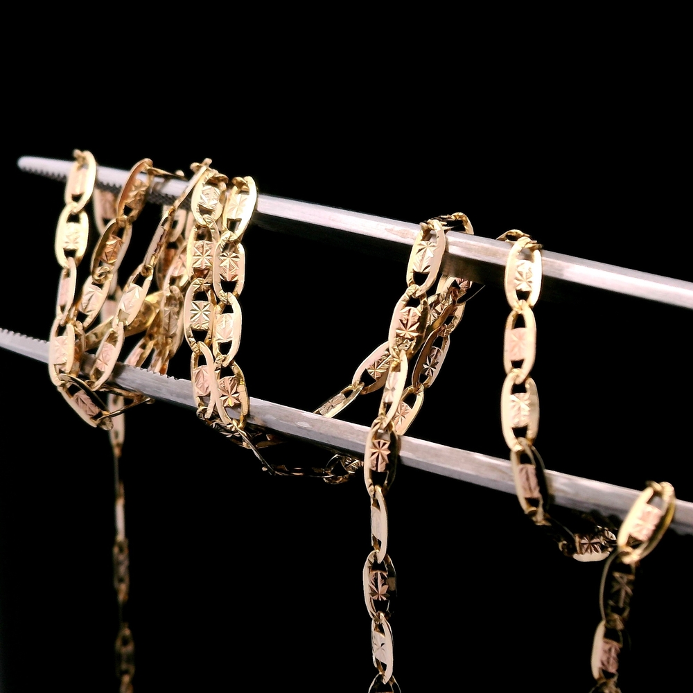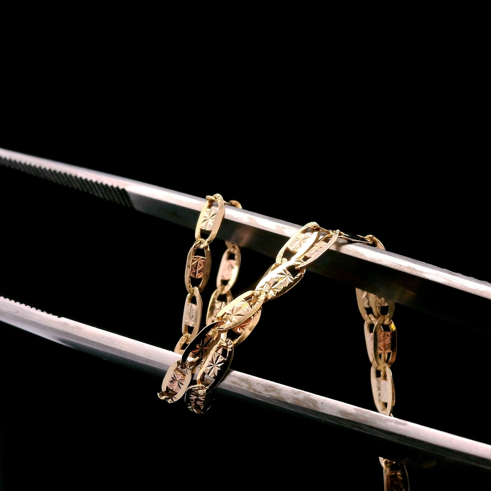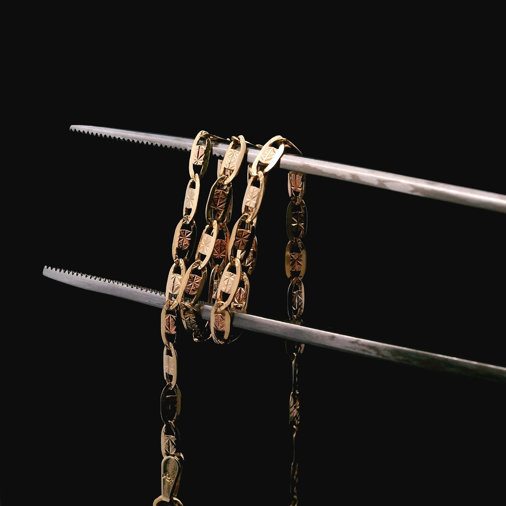 Esta cadena de oro tricolor de 14KT combina tonos amarillo, blanco y rosa para un estilo sutil y elegante, ideal para usar sola o con dije.