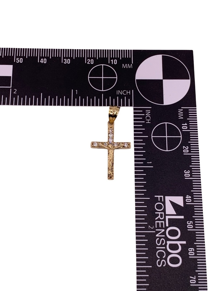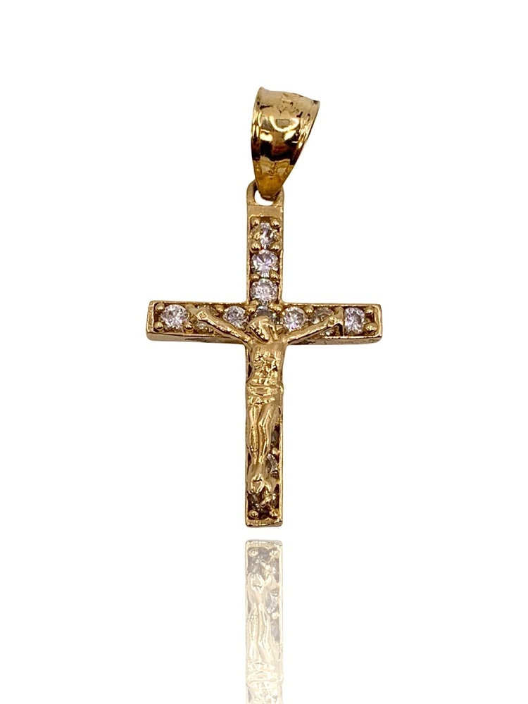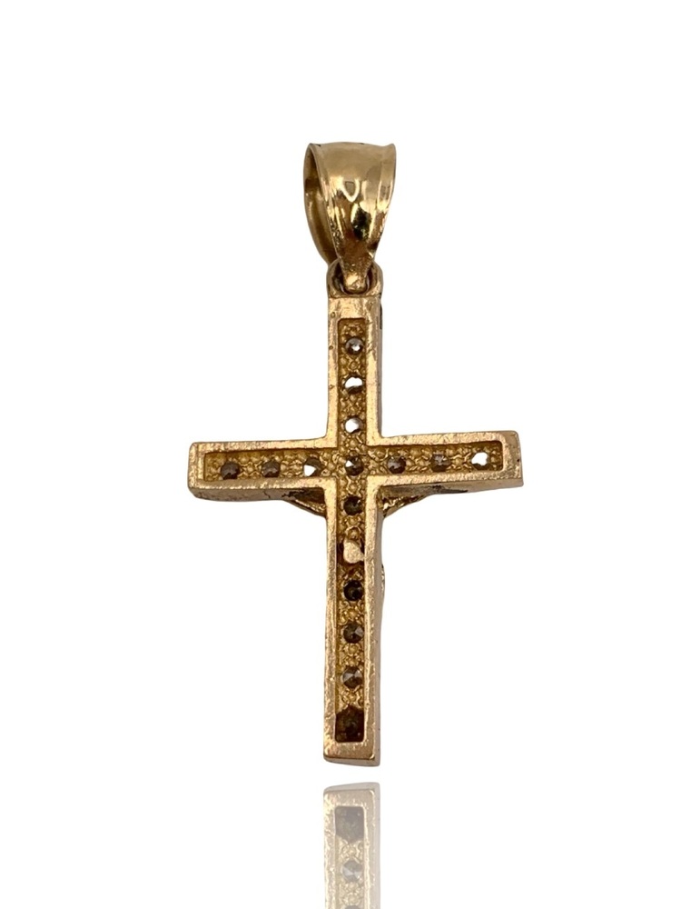 This listing is for a 14kt yellow gold small crucifix charm featuring non-diamond accents. The piece has a classic religious design and is crafted in solid yellow gold. It is pre-owned and shows light wear consistent with normal use.