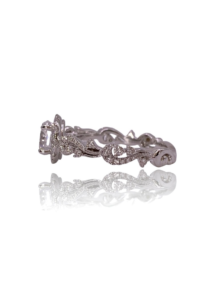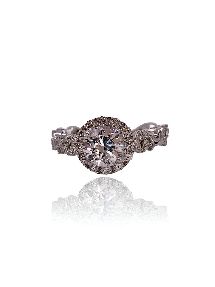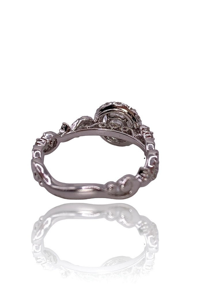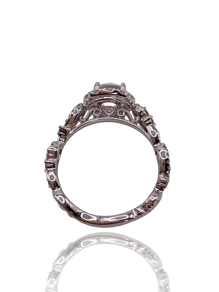 This beautiful 18kt white gold ladies ring setting features a round CZ center stone surrounded by a halo design. The band is crafted with intricate filigree detailing and natural diamond accents, offering a refined and elegant look. Perfect for daily wear or as a statement piece.