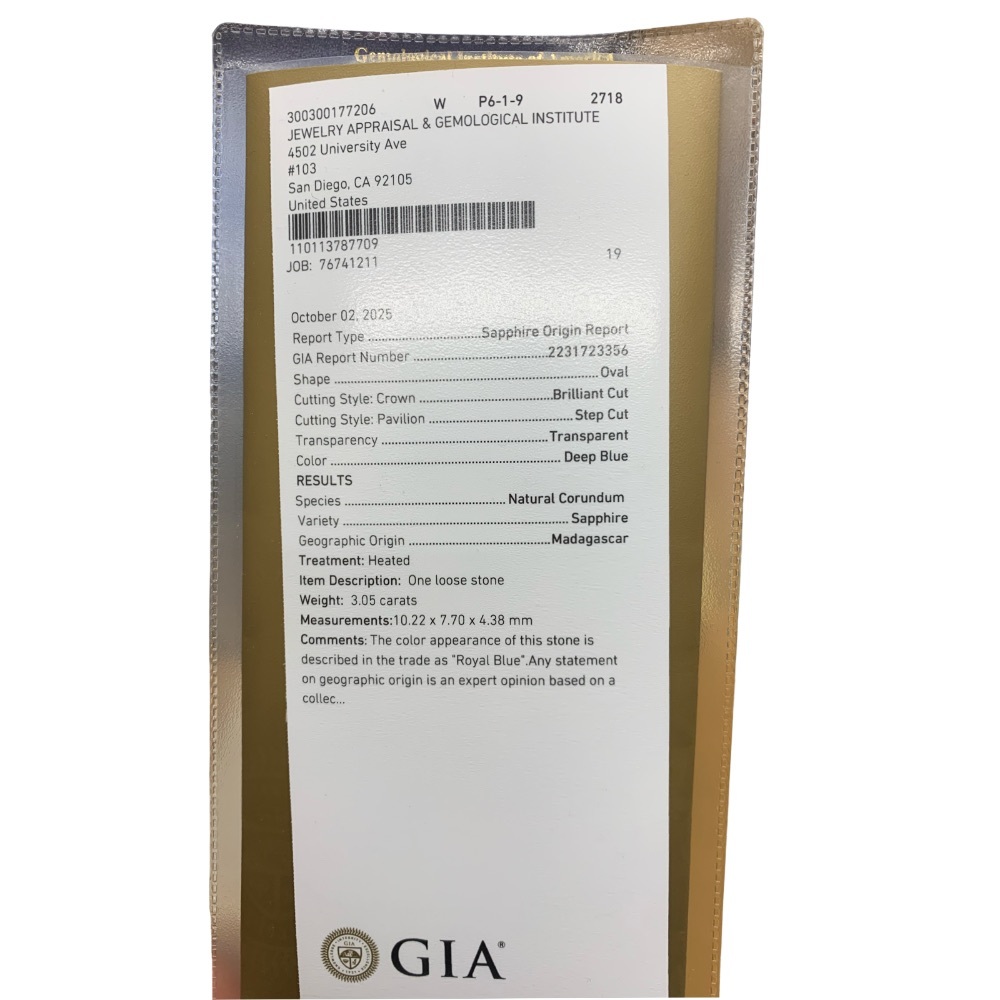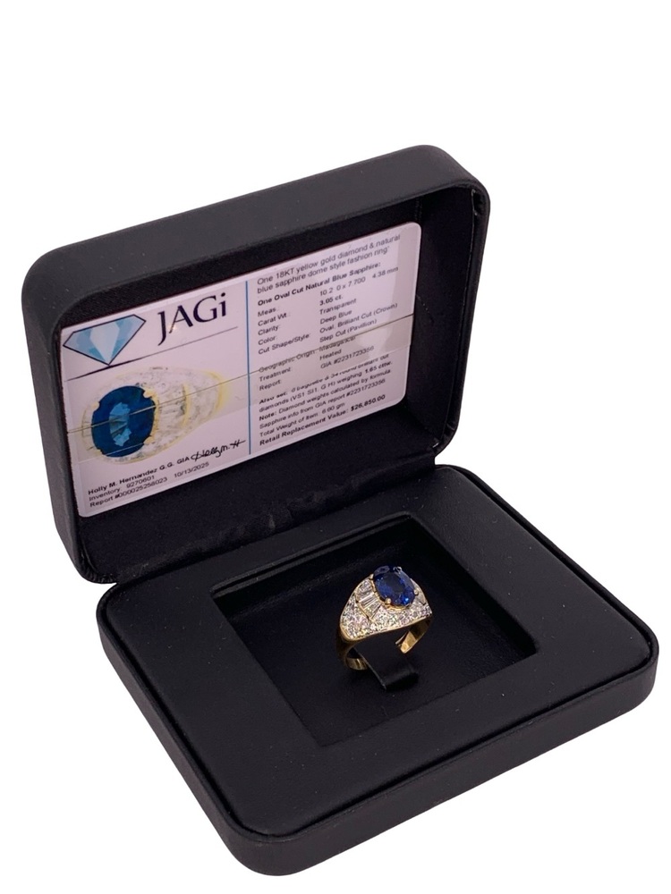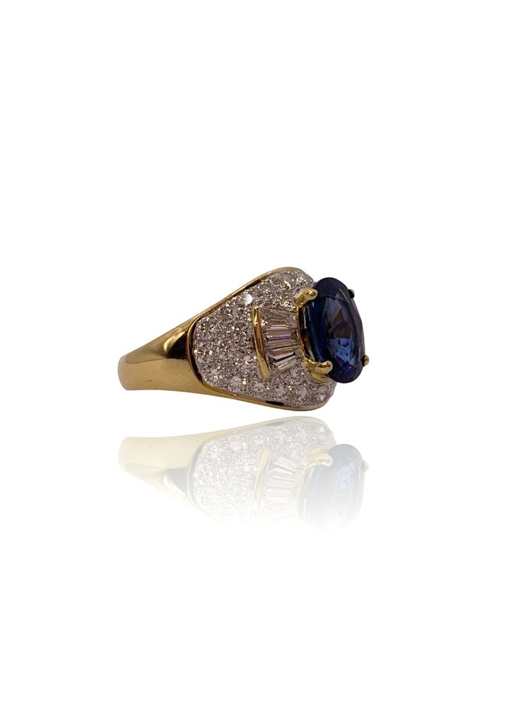 This listing is for a stunning ladies 18K yellow gold ring featuring a vivid oval-cut blue sapphire surrounded by round and baguette diamonds. The sapphire exhibits a brilliant crown cut and step-cut pavilion, showcasing a royal blue hue with exceptional transparency.