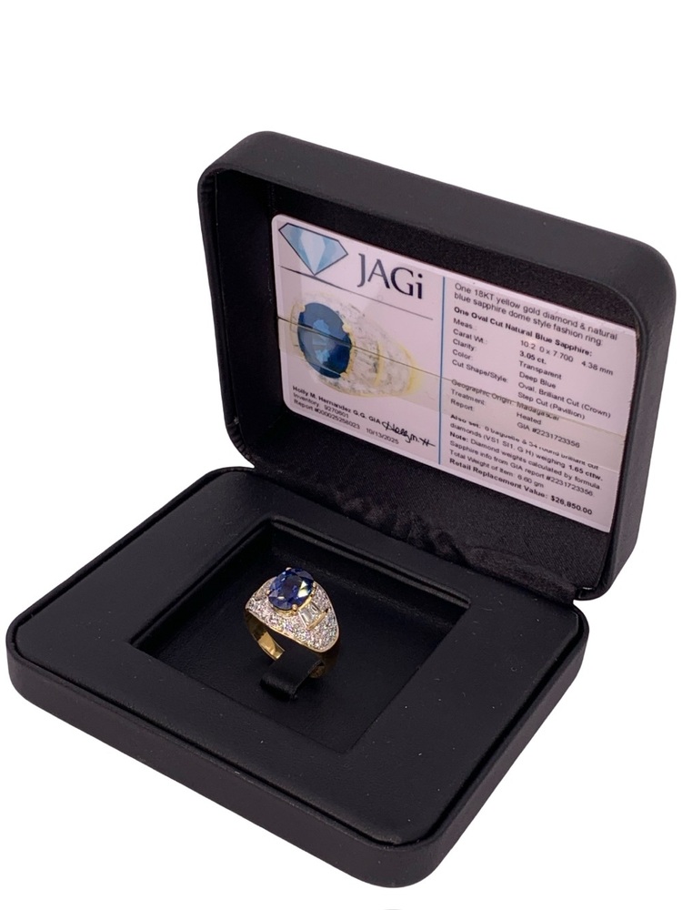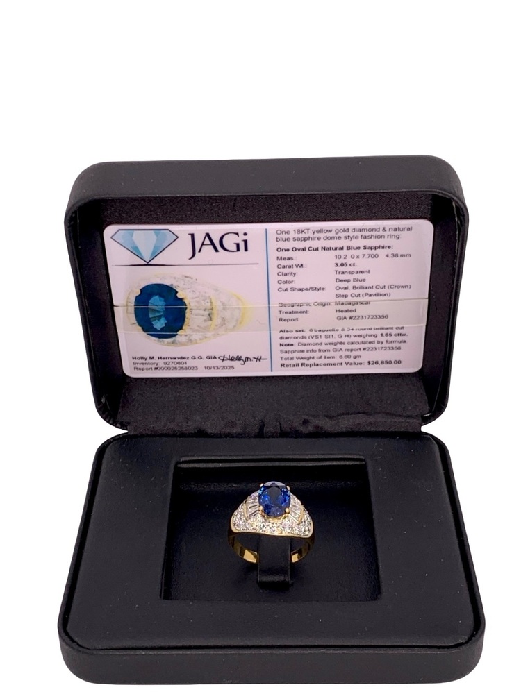 JAGI 18K Yellow Gold Ladies Ring – Oval Blue Sapphire with Round and Baguette Diamonds – Size 9
