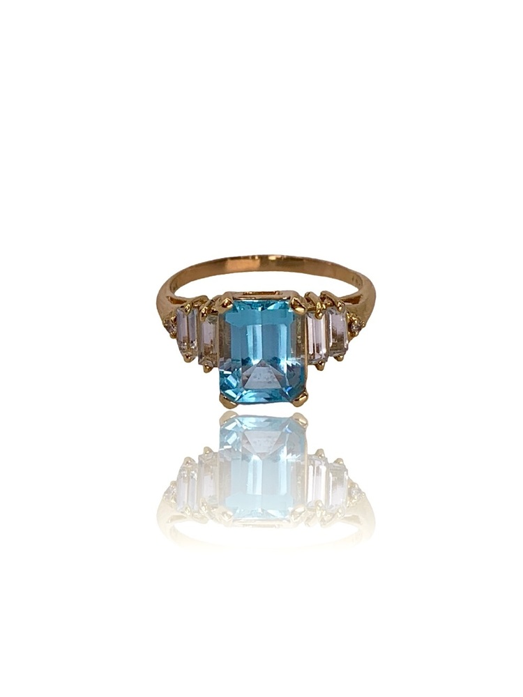 Elegant and eye-catching, this 14KT Yellow Gold Ladies’ Ring features a beautiful blue center stone in a classic step-style design, accented by two tiny diamonds for added sparkle. Ring is size 10, and resizing is available upon request.
