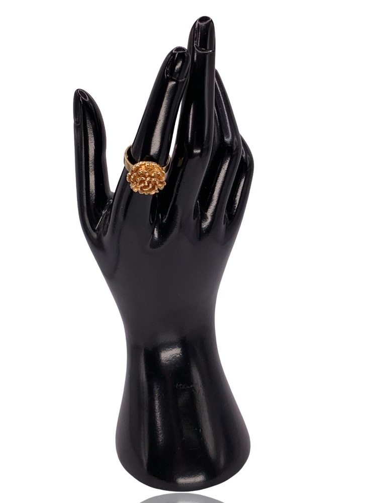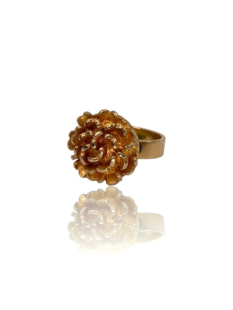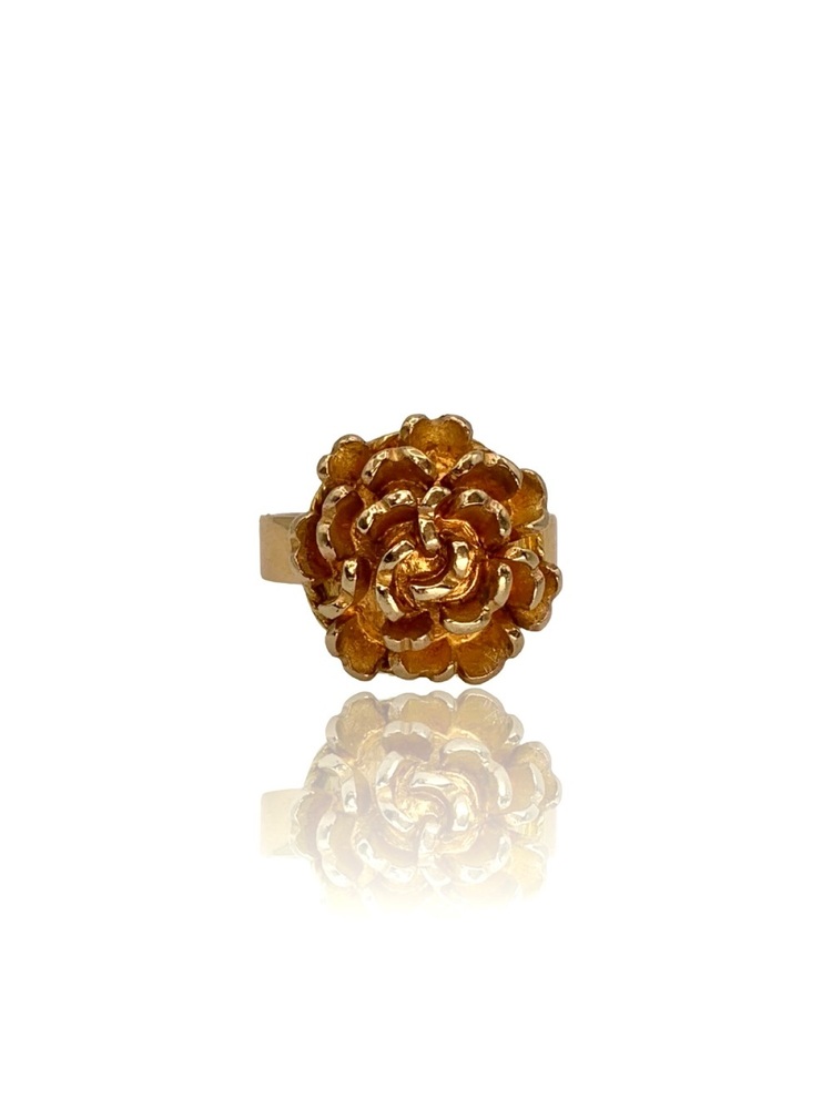 Elegant 18KT Yellow Gold Ladies Ring featuring a thick, bold band with a beautifully crafted flower design on top. Heavy, high-quality gold with excellent craftsmanship. Ring is size 7, and resizing is available upon request.
