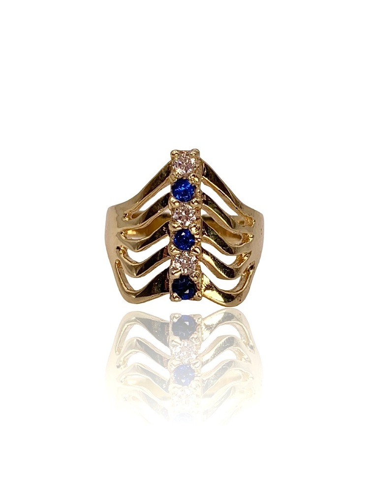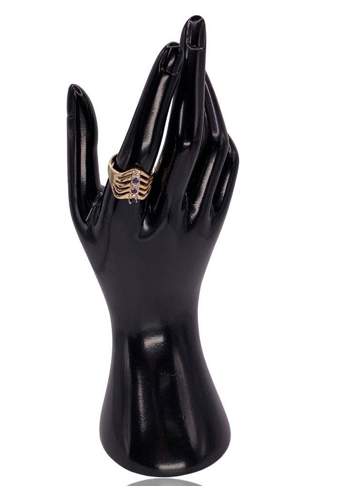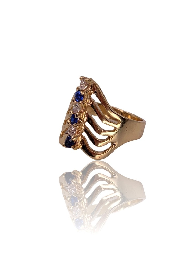 Size 8.5 – Resizing Available– 5.10 DWT (7.93g) 14KT Yellow Gold Ladies Ring w/ Blue & White Stones
