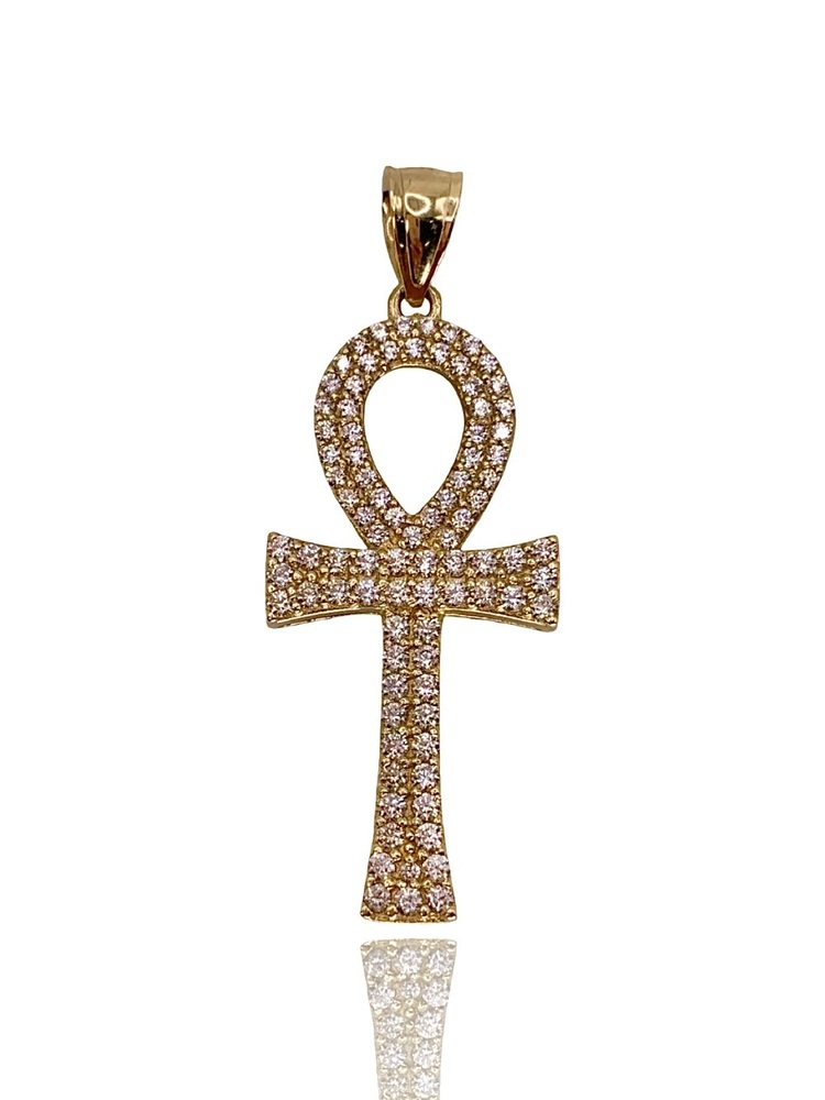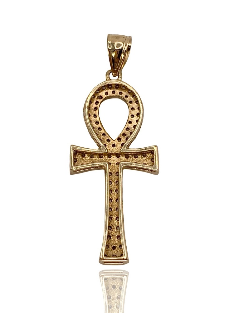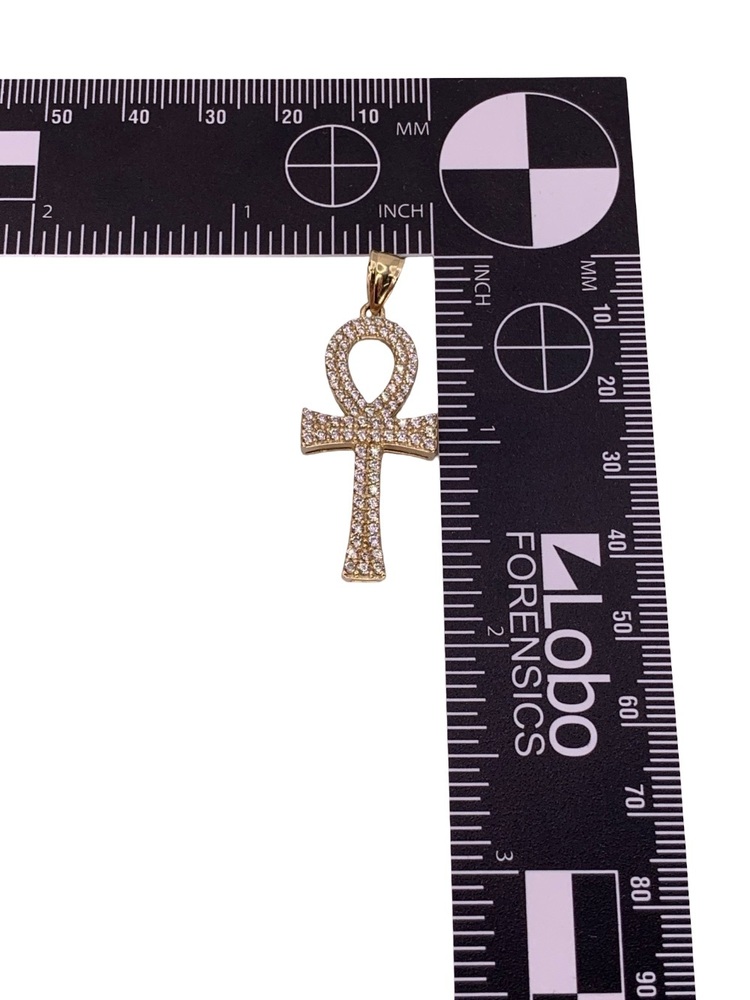 This listing is for a 10kt yellow gold Ankh cross charm. The piece features a classic Ankh design with non-diamond accents throughout. It is pre-owned and shows light wear consistent with normal use.