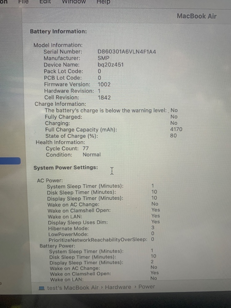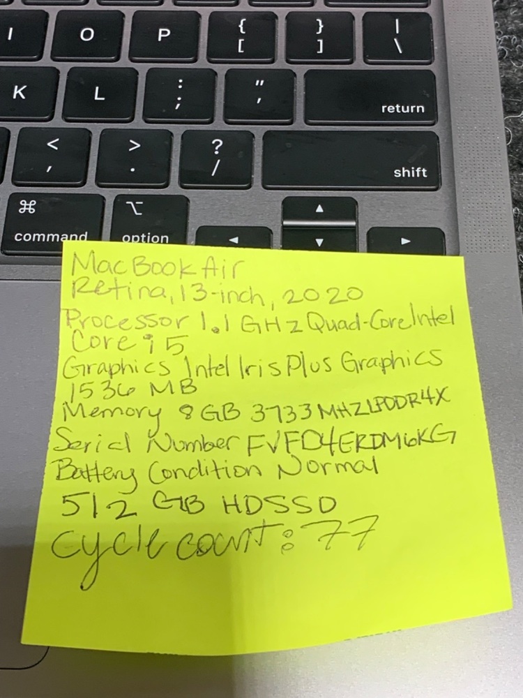 Apple MacBook Air 13" (A2179, 2020) – Intel i5 – 8GB RAM – 512GB SSD – Used – No Charger – 77 Battery Cycles