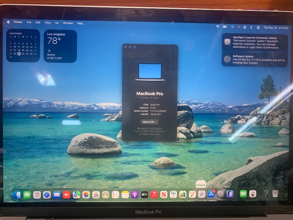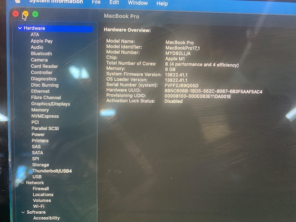 This listing is for a used 2020 Apple MacBook Pro (Model A2338) featuring the fast and efficient Apple M1 chip, 8GB RAM, and 256GB SSD. The MacBook powers on, reaches the login screen.