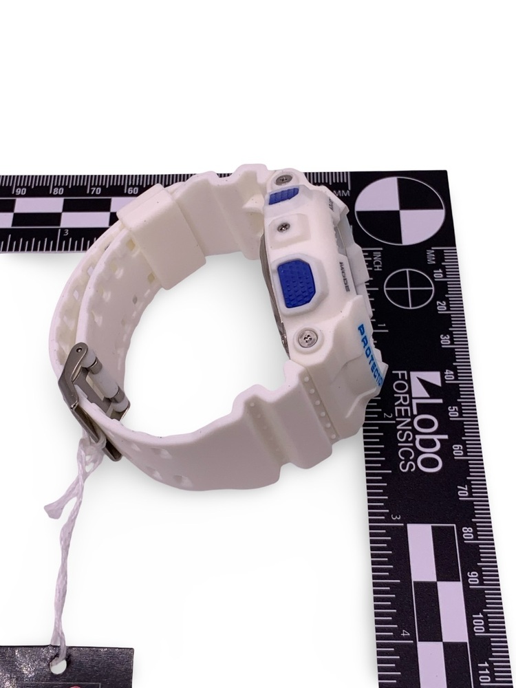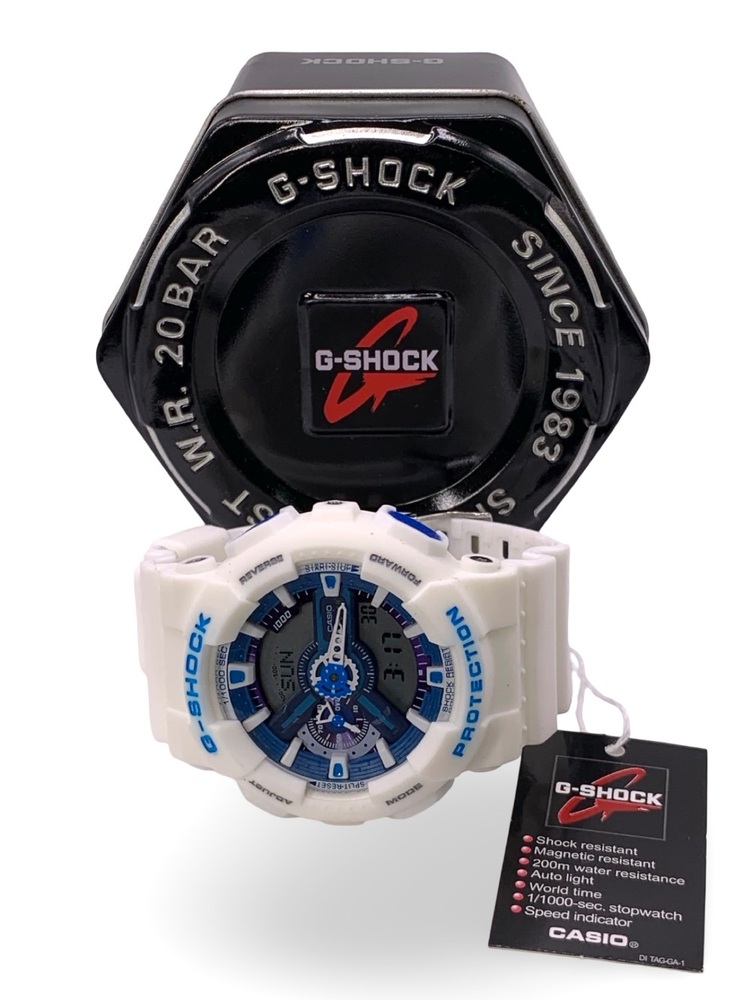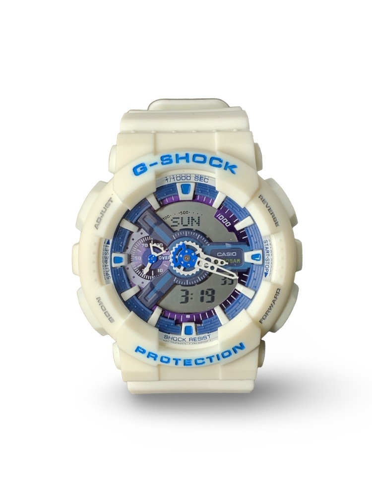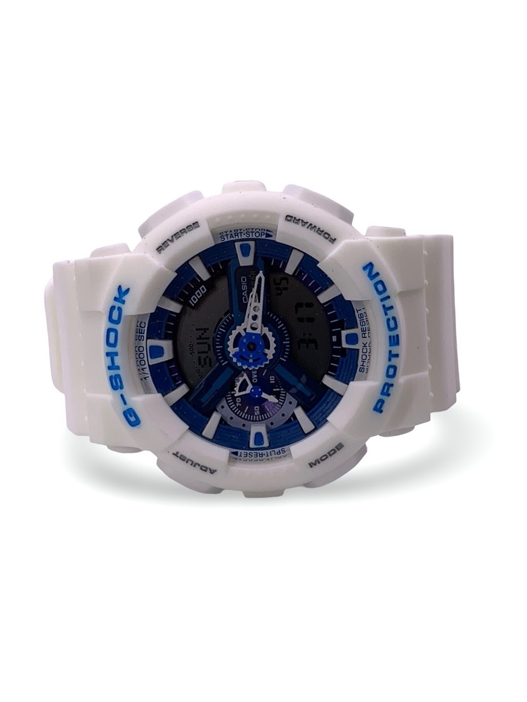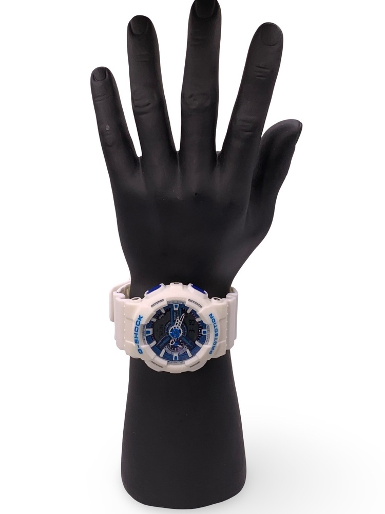 This listing is for a Casio G-Shock GA-110WB men’s wristwatch, featuring a white and blue colorway with both digital and analog displays.