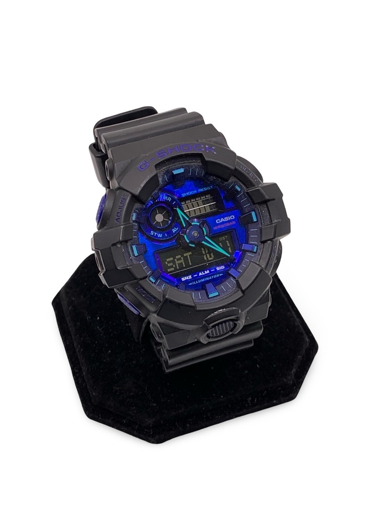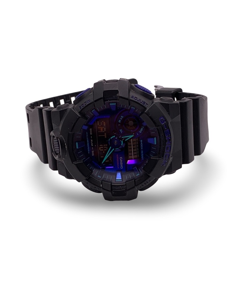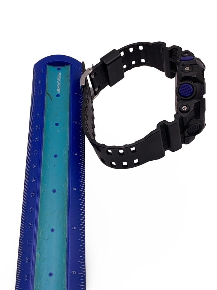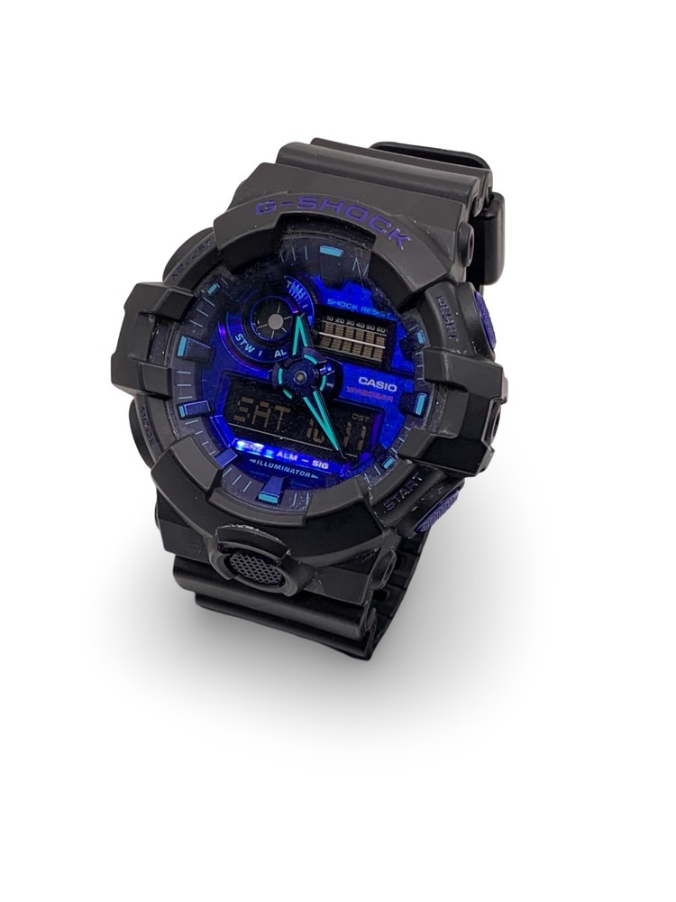 This is a used Casio G-Shock GA700VB-1A (Module 5522) men’s sport watch in good working condition. It features a large 53.4mm black resin case with violet-blue accents, offering a bold and durable design suited for active lifestyles.
