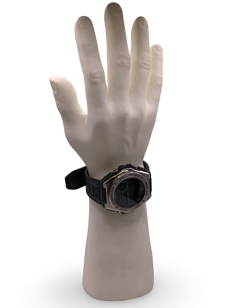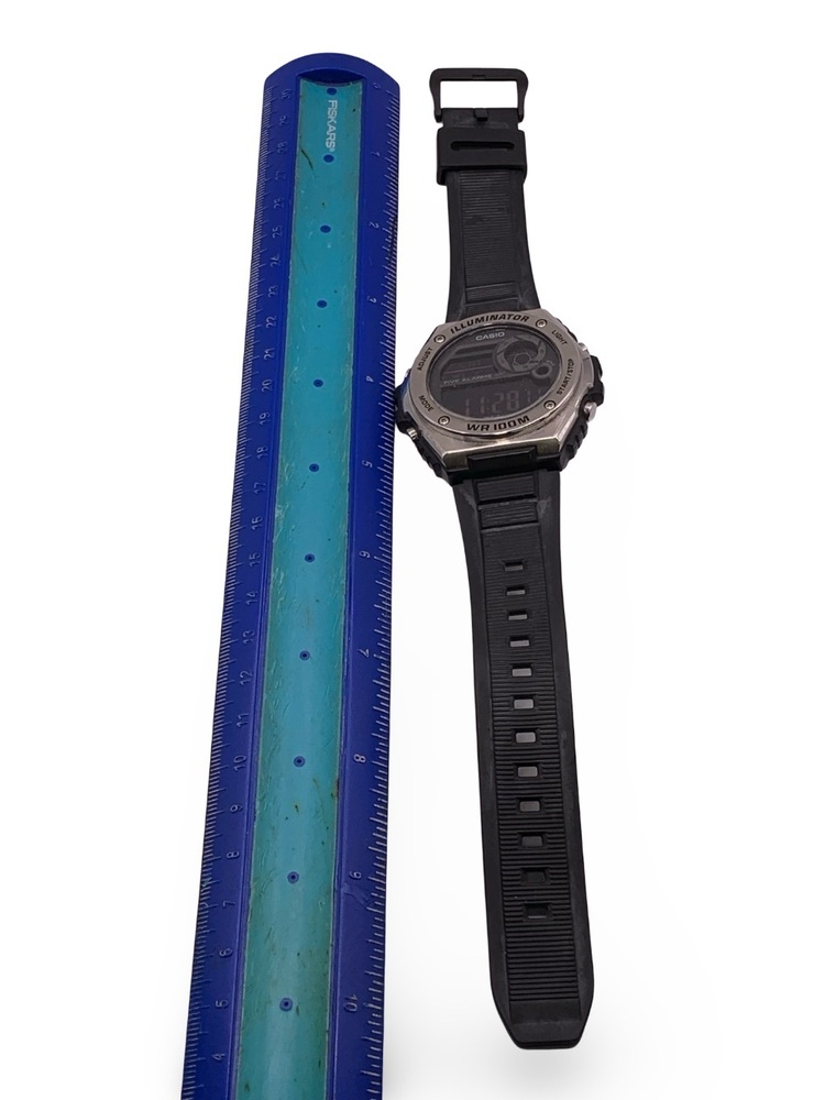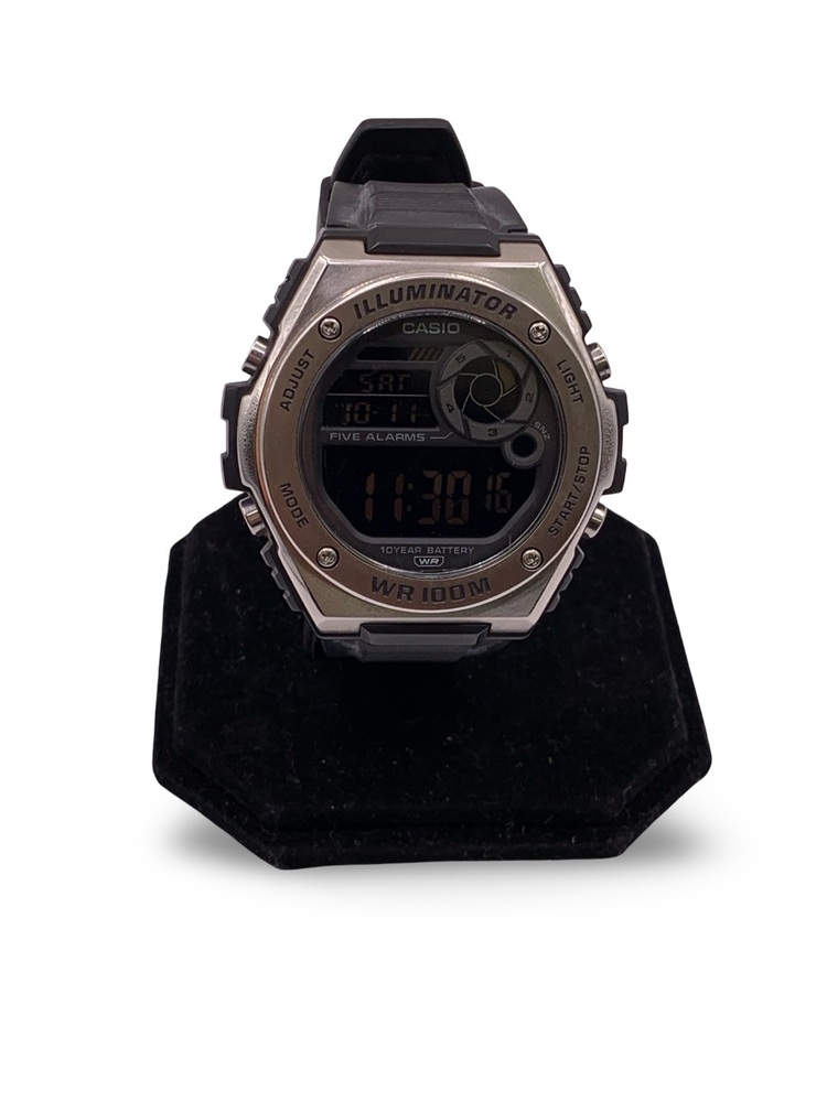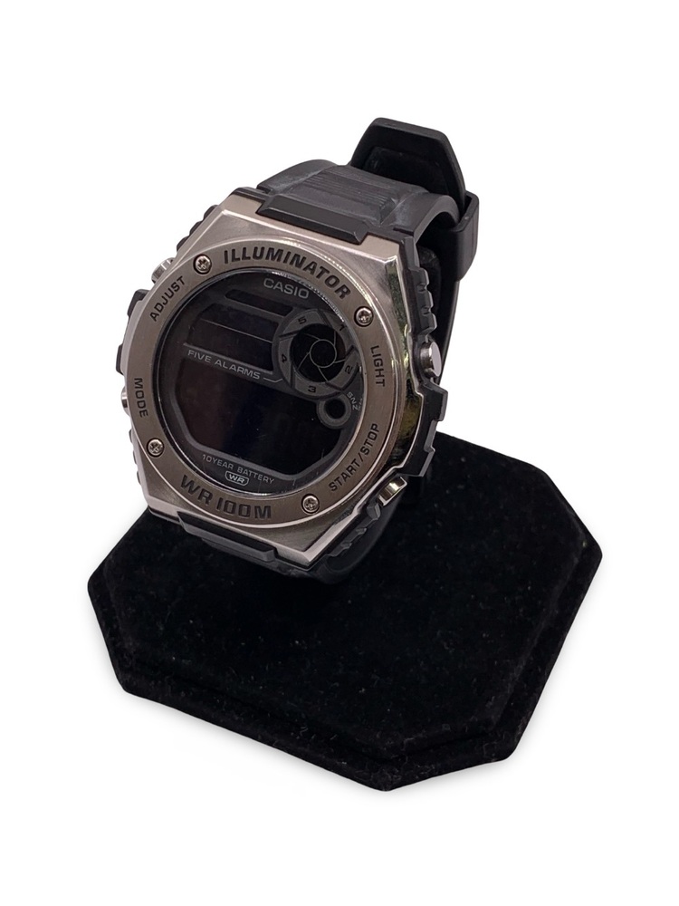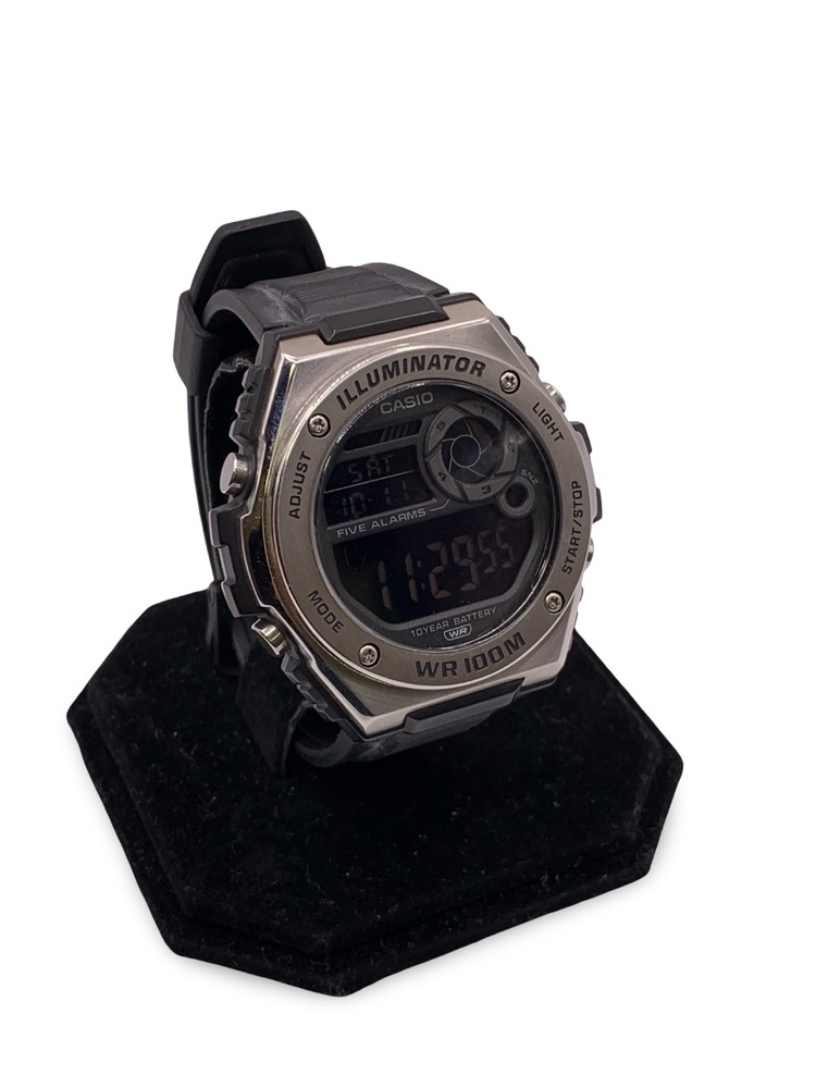 This is a used Casio MWD-100H Illuminator watch in good working condition. It features a stainless steel bezel, a 40mm case, and 100M water resistance, making it a reliable and stylish digital watch for everyday wear.