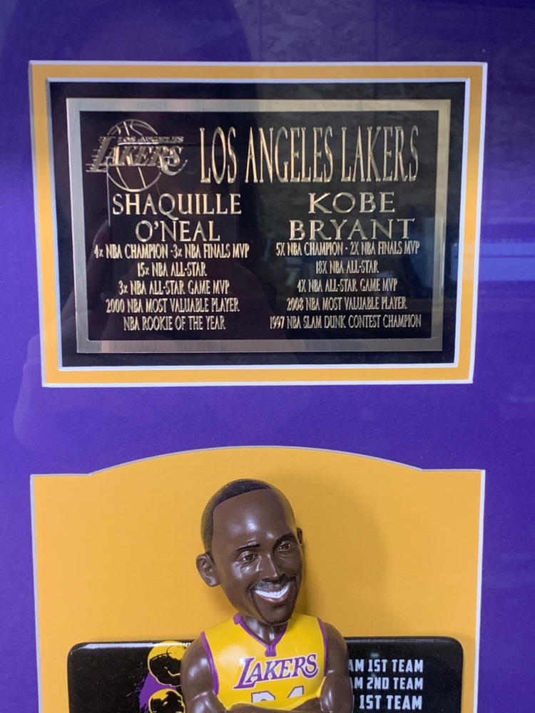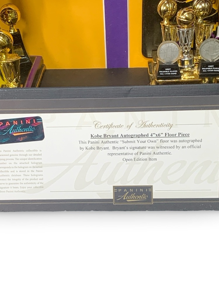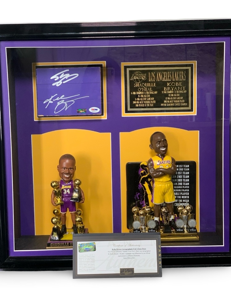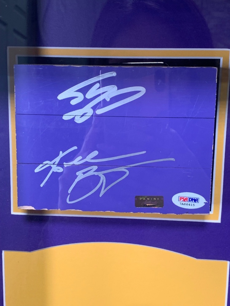 Unique framed collectible featuring a piece of the Staples Center floor, autographed by Kobe Bryant and Shaquille O’Neal. Kobe Bryant’s signature is authenticated by Panini (Certification Number: PA442398) and Shaquille O’Neal’s signature is authenticated by PSA/DNA (Certification Number: 7A66415).