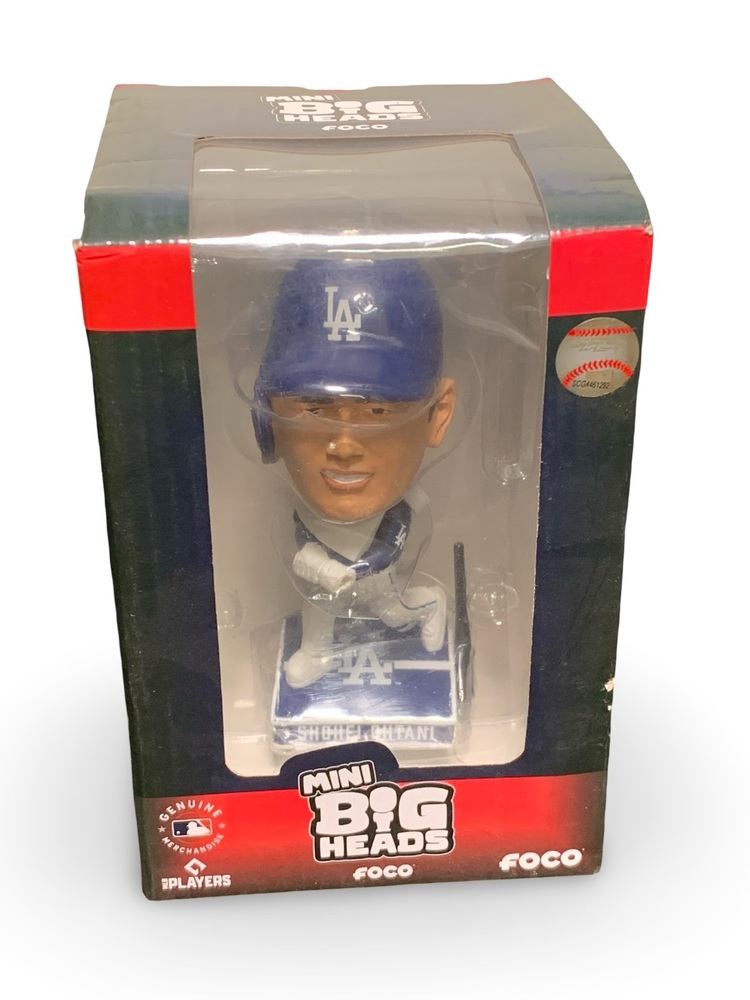 Official FOCO Mini Big Heads collectible featuring Shohei Ohtani, the two-way MLB star. This miniature figure highlights Ohtani’s likeness in a fun, stylized design and is perfect for display or adding to any baseball memorabilia collection.