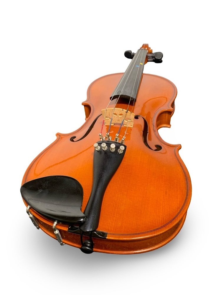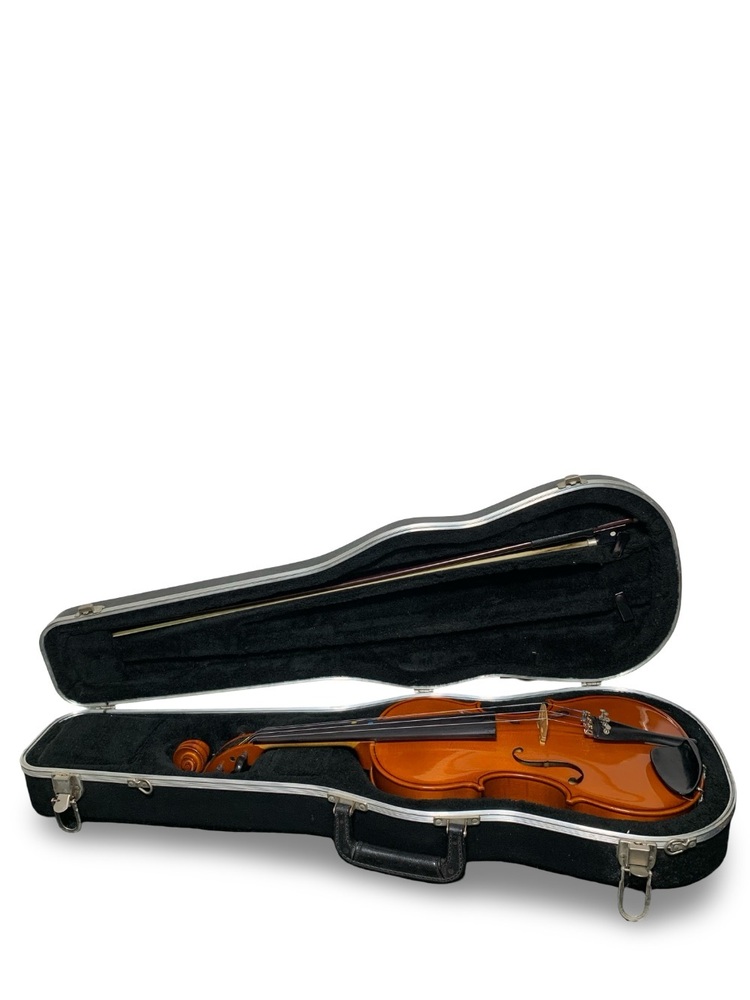 Used and in good working condition. Shows normal signs of handling such as light surface wear or minor scratches. Violin has been inspected — no major cracks or structural issues. Includes bow and hard case.