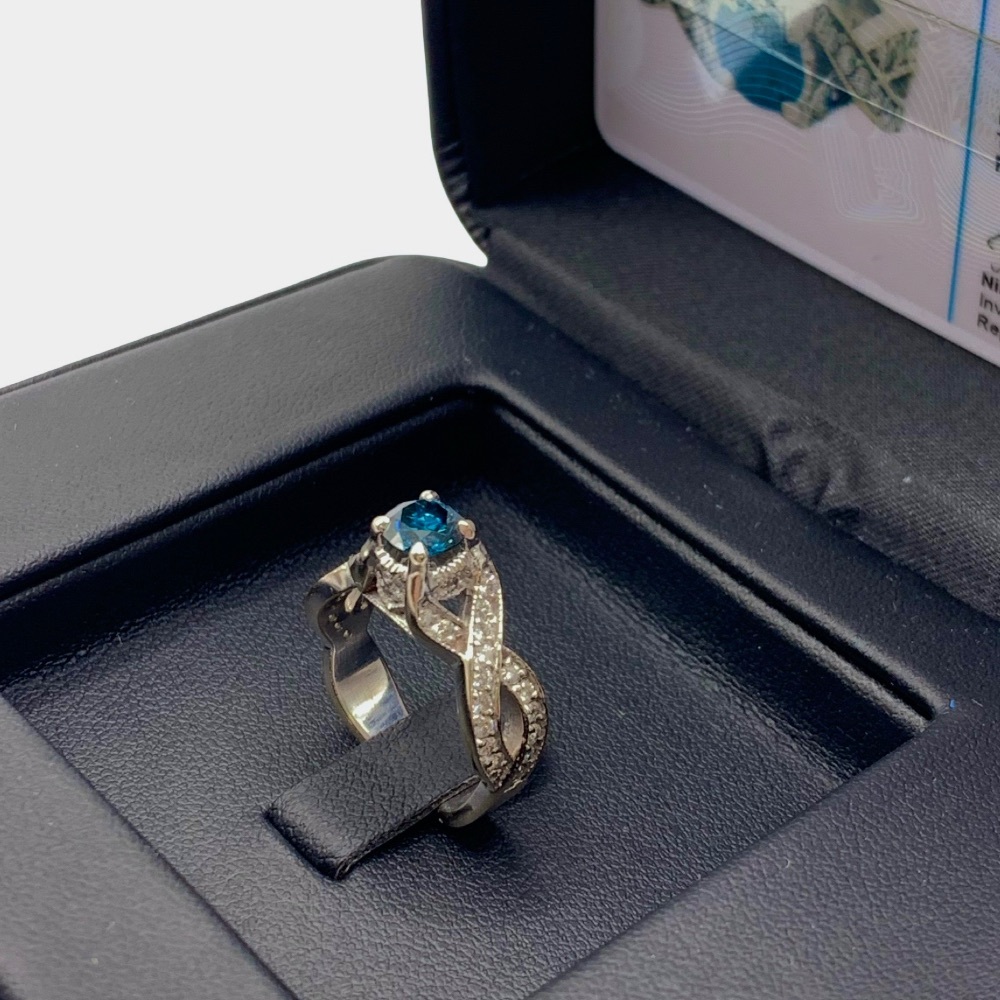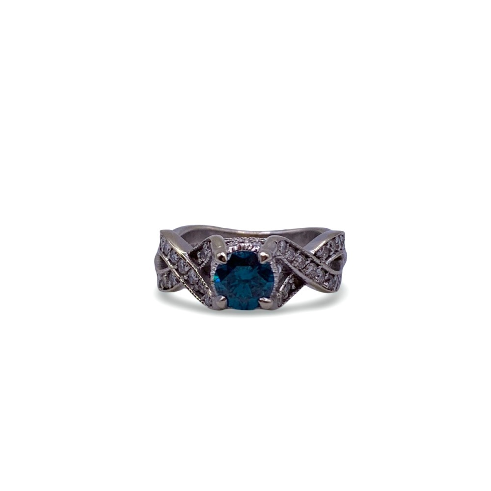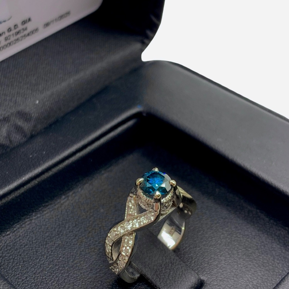 • Center Stone: Round Fancy Greenish-Blue Diamond – Approximately 0.67 ct – SI2 Clarity