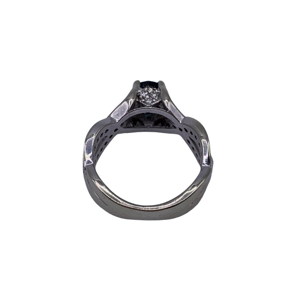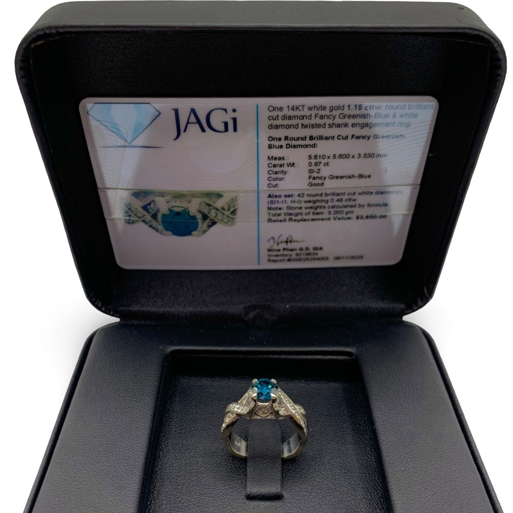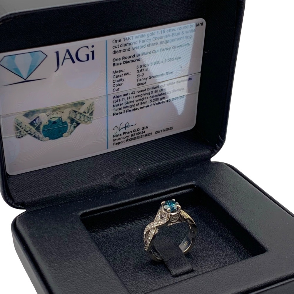 14K White Gold Ladies Ring – Jagi – Greenish-Blue Diamond Center – Halo Design – 1.15 cttw