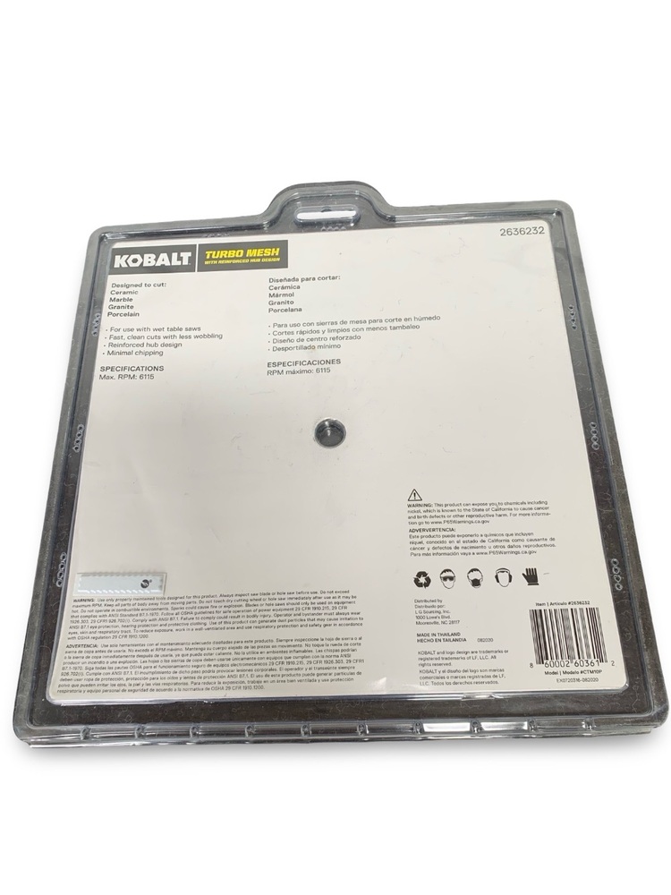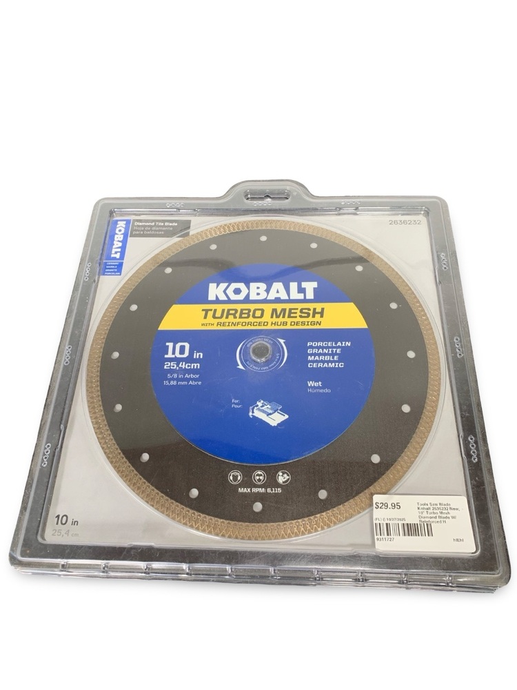 The Kobalt 2636232 10-inch Turbo Mesh Diamond Blade is engineered for fast, clean, and precise cutting in tile, stone, masonry, and similar materials. Its reinforced hub design ensures added durability and stability for smoother performance and longer blade life.