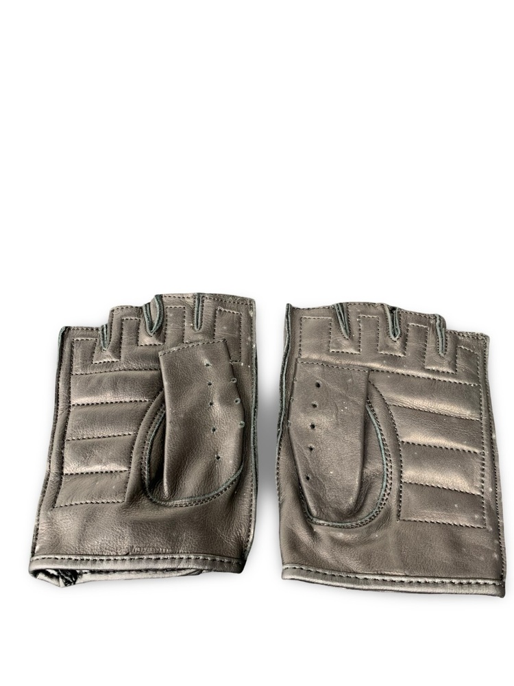 This listing is for a pair of black leather half-finger gloves, offered in used condition, size Large. The gloves show normal signs of wear consistent with regular use.