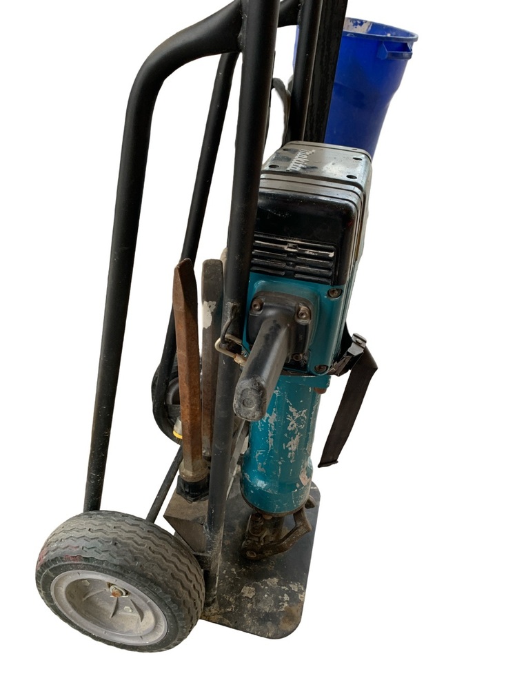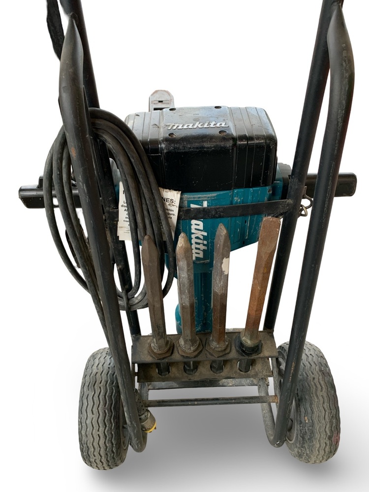 Presenting the Makita HM1810 Demolition Hammer - A robust, 70 lb corded machine undoubtedly an unbeatable workhorse in its domain. It comes mounted on a handy dolly, easing portability and use. The package includes 4 distinct bits to cater to varied requirements. Despite signs of regular use, its efficiency remains unhindered. The high-performance motor leaves no stone unturned, ensuring that every demolition job is handled with the utmost precision. Make this wearable and practical tool your right hand on every construction site. Grab your piece now!
