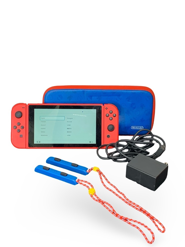Used Nintendo Switch Mario Edition console, model HAC-001. Includes original charger and carrying case. Dock not included. Console is in used condition with light to moderate wear from normal use. Fully functional and tested.