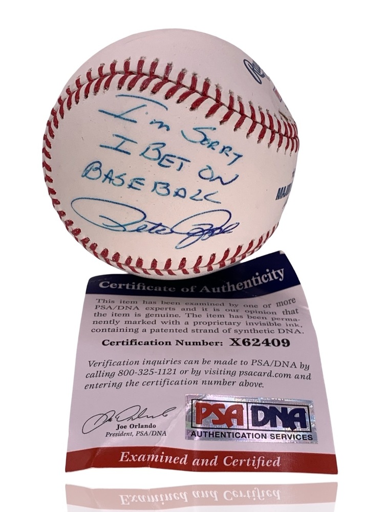 This listing is for an authentic Rawlings MLB baseball autographed by Pete Rose, featuring the well-known inscription “I’m Sorry I Bet On Baseball” and authenticated by PSA/DNA.