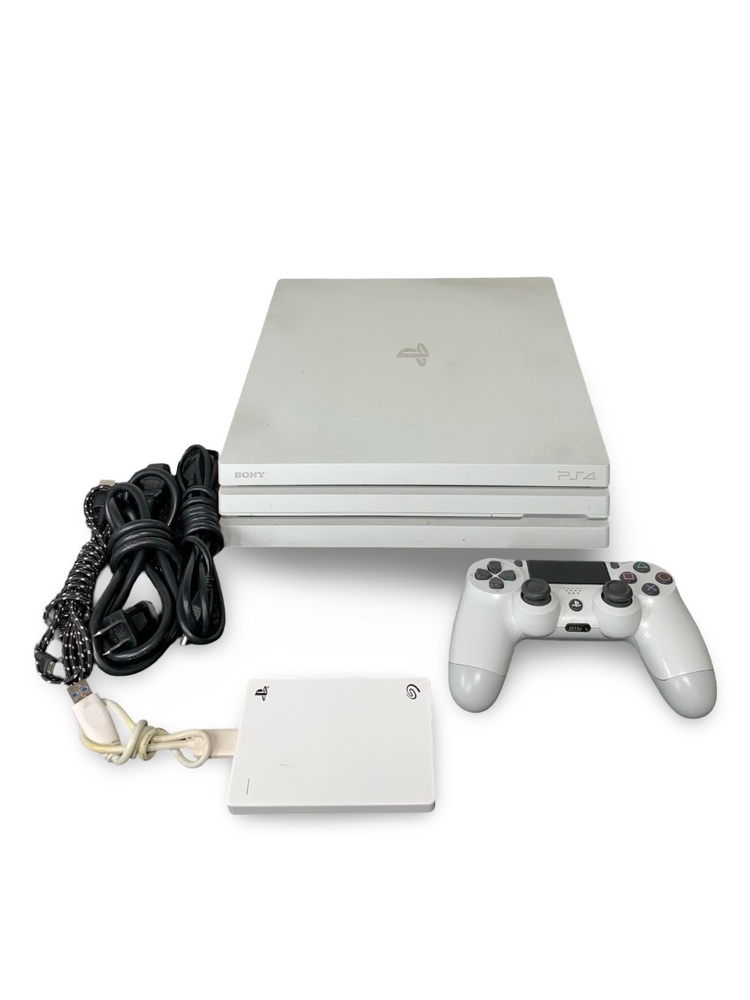 This listing is for a pre-owned PlayStation 4 Pro (Destiny 2 Edition). Includes 1TB internal storage, 2TB external hard drive, and comes bundled with the Spider-Man game, HDMI, power and USB cables, plus a white controller. Perfect for gamers looking for a complete setup ready to play.