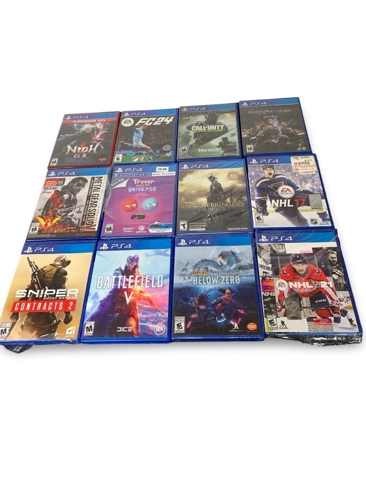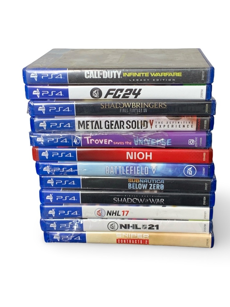 PS4 Game Bundle – 12 Games – FC24, COD Advanced Warfare, Shadowbringers, MGS5, Trover Saves the Universe, Nioh, Battlefield 5, Subnautica, Shadow of War, NHL17/21, Sniper Contracts 2 – Mixed Condition