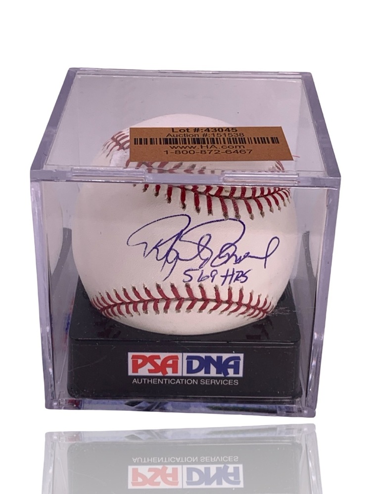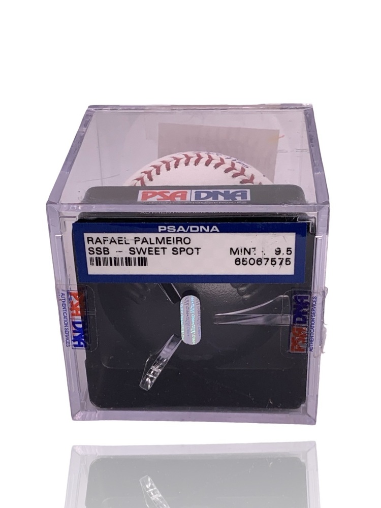 This listing is for an authentic Rawlings MLB baseball autographed by Rafael Palmeiro, signed cleanly on the sweet spot and accompanied by PSA/DNA Certification of Authenticity, graded Mint 9.5.