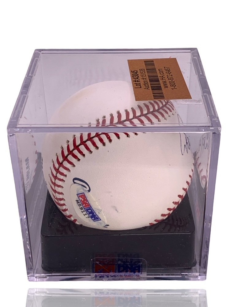 Pre-owned. Baseball shows light handling wear consistent with display. Autograph remains bold and well-preserved. PSA/DNA sticker seal is undone; certification still applies. Please review photos for exact condition.