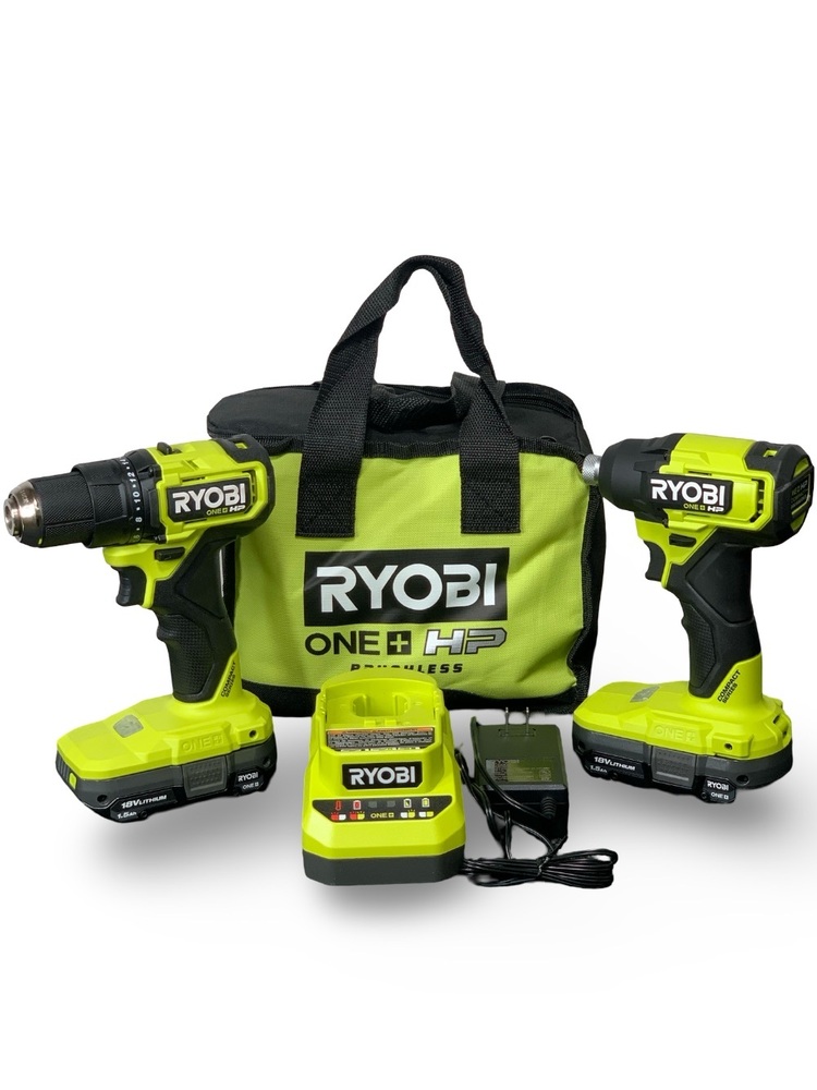 Ryobi ONE+ HP 18V Brushless Drill & Impact Driver Combo Kit – 1/2" – (2) 1.5Ah Batteries, Charger, Bag – SN TM24503D270717