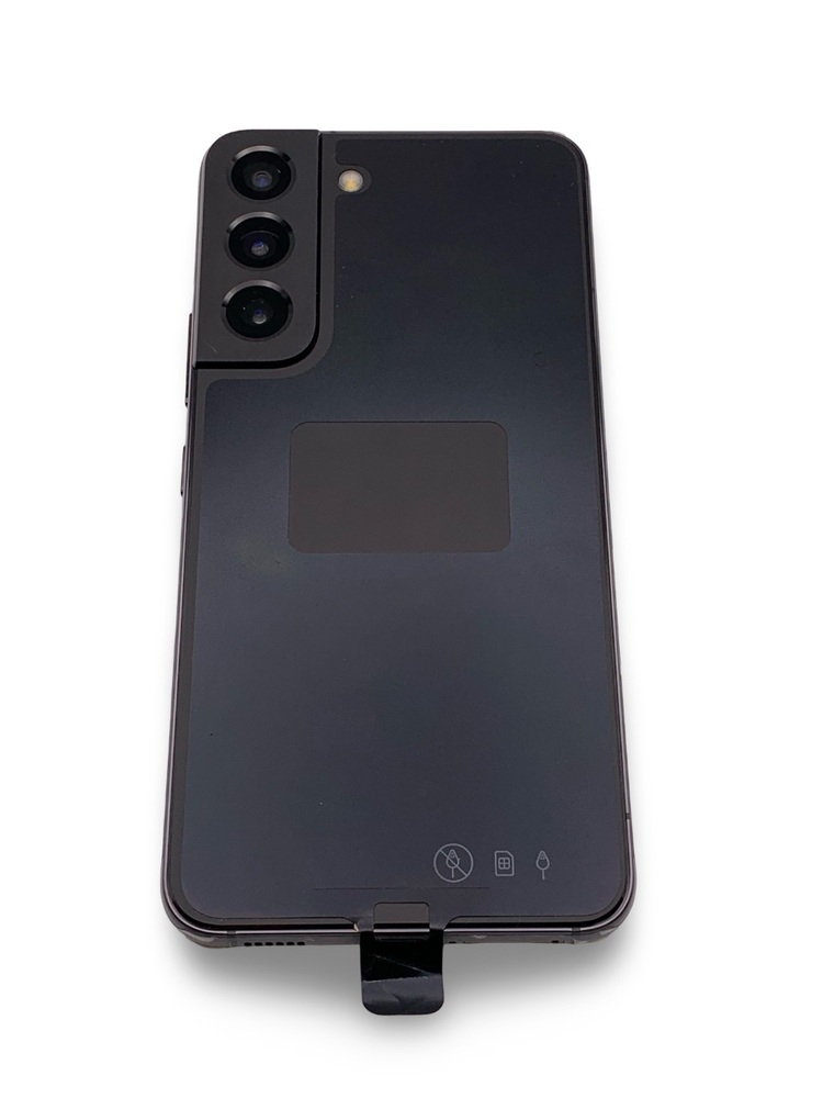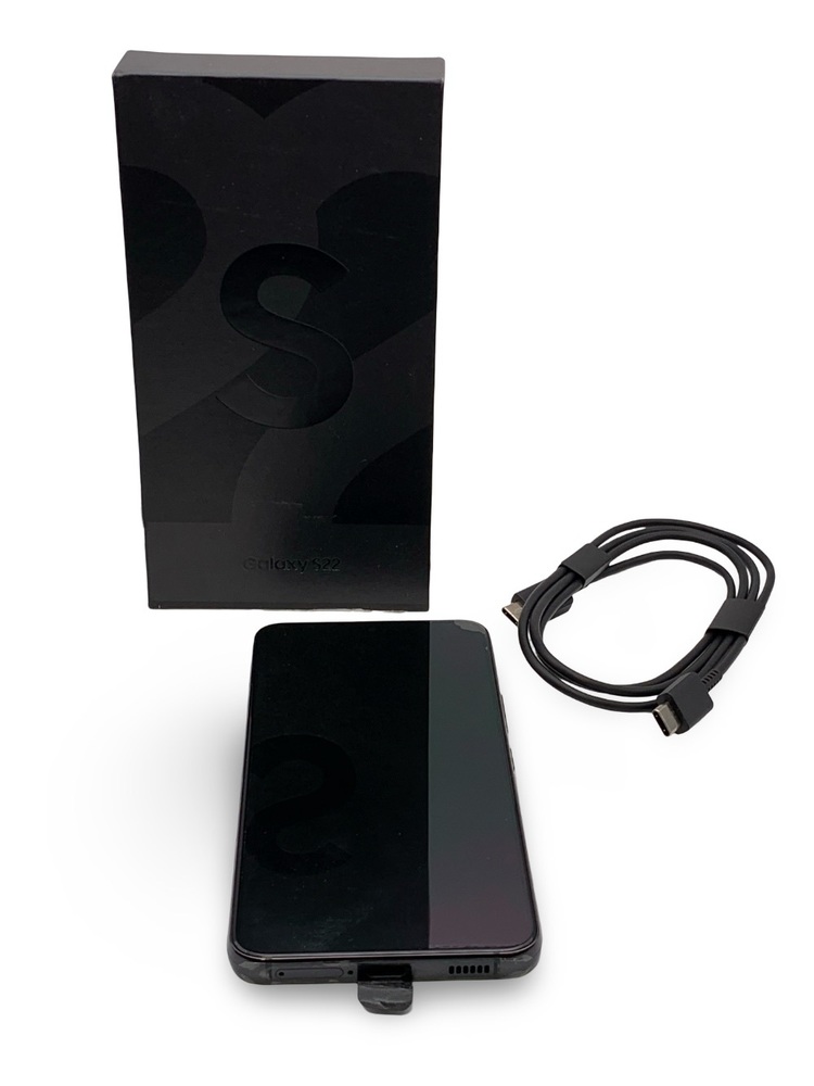 Used Samsung Galaxy S22, model SM-S901U, with 256GB storage in the Rainbow Edition (Black) color. The device is in excellent condition, previously opened but lightly used.
